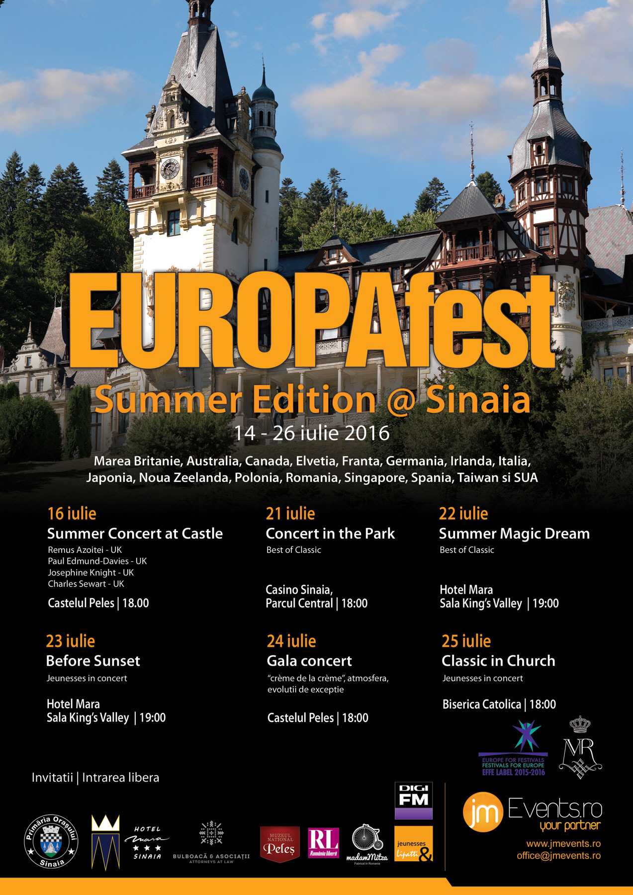 Festivalul EUROPAfest, eveniment sub Înaltul Patronaj al Casei Regale, aduce în cadrul ediției de vară de la Sinaia 6 concerte de muzică clasică și Summer Music Academy Sinaia. Devenită deja o tradiție, deschiderea EUROPAfest Summer Edition are loc sâmbătă, 16 iulie 2016, de la ora 18.00, la Castelul Peleș, în Sala de concerte a reședinței regale. Organizator: jmEvents; parteneri: Primăria Sinaia, Hotel Mara si Castelul Peleș.
