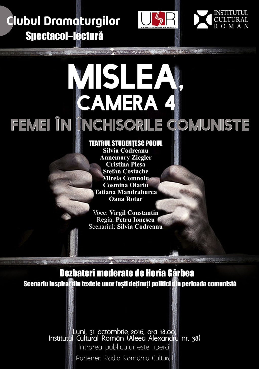 Luni, 31 octombrie 2016, ora 18.00, la sediul Institutului Cultural Român (Aleea Alexandru nr. 38), Institutul Cultural Român și Uniunea Scriitorilor din România, prin Filiala București–Dramaturgie și Filiala București–Poezie, anunță deschiderea stagiunii 2016–2017 la Clubul Dramaturgilor cu premiera absolută, în lectură publică, a piesei ”Mislea, camera 4. Femei în închisorile comuniste”.