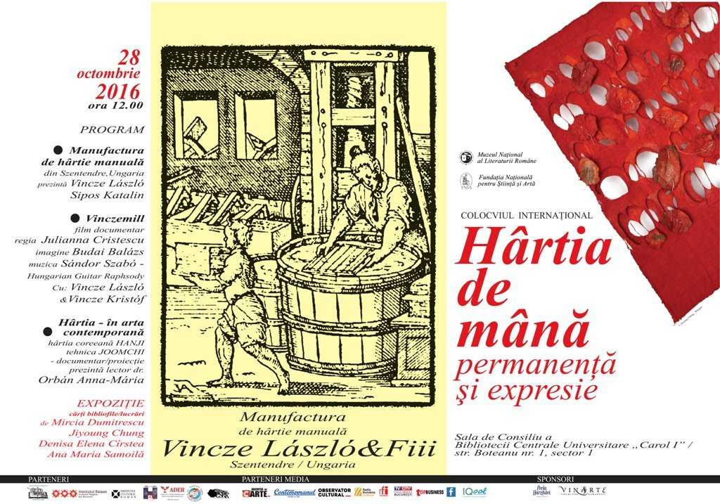 Vineri, 28 octombrie 2016, ora 12.00, în Sala de Consiliu a Bibliotecii Centrale Universitare „Carol I”, din Strada Boteanu nr. 1, Muzeul Național al Literaturii Române, împreună cu Biblioteca Centrală Universitară „Carol I”, Fundația Națională pentru Știință și Artă, Institutul Cultural Român, Institutul Cultural Maghiar Balassi, Facultatea de Arte a Universității Hyperion, Asociația ADER „Om între oameni”, Universitatea Româno-Americană și Centrul de Studii Româno-Coreean, organizează Colocviul internațional „Hârtia de mână – permanență și expresie”. AgențiadeCarte.ro este partener media al evenimentului.