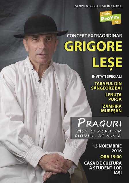 Duminică, 13 noiembrie 2016, de la ora 19.00, la Casa de Cultură a Studenților din Iași va avea loc evenimentul artistic „Praguri – hori și zicăli din ritualul de nuntă”, cu participarea lui Grigore Leșe, a Tarafului din Sângeorz Băi și a horitoarelor Lenuța Purja și Zamfira Mureșan. Concertul este organizat de către Departamentul Pro Vita al Arhiepiscopiei Iașilor în parteneriat cu Asociația Familia Tradițională, în cadrul ediției a VI-a a Zilelor Pro Vita Iași – A fi sau a nu fi căsătorit? O întrebare a omului. (9 – 13 noiembrie).