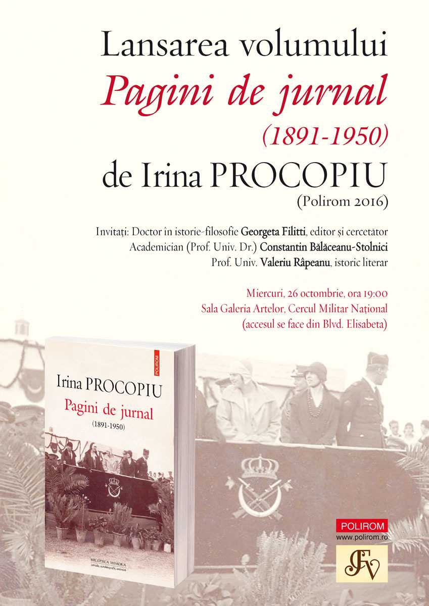 Miercuri, 26 octombrie 2016, de la ora 19:00, în Sala Galeria Artelor (Cercul Militar Naţional din Bucureşti), Editura Polirom şi Fundaţia Calea Victoriei vă invită la lansarea celui mai nou volum apărut în colecţia „Biblioteca Memoria. Jurnale, autobiografii, amintiri”: ”Pagini de jurnal (1891-1950)”, de Irina Procopiu, traducere din limba franceză, introducere, note şi comentarii de Georgeta Filitti, disponibil şi în ediţie digitală. Invitaţi: Doctor în istorie-filosofie Georgeta Filitti, editor şi cercetător; Academician (Prof. Univ. Dr.) Constantin Bălăceanu-Stolnici; Prof. Univ. Valeriu Râpeanu, istoric literar.