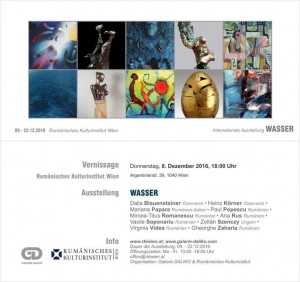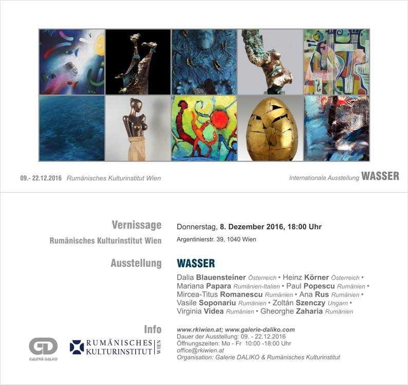 În perioada 8-22 decembrie 2016, Institutul Cultural Român de la Viena în colaborare cu galeria Daliko din Krems prezintă expoziţia „Wasser“ („Apa“). Vernisajul expoziţiei are loc joi, 8 decembrie, de la ora 18.00, la galeria ICR Viena, în prezenţa artiştilor Mircea-Titus Romanescu, Ana Rus, Paul Popescu, Vasile Soponariu şi a curatorului Dalia Blauensteiner. Proiectul este realizat de Uniunea Artiștilor Plastici din România şi își propune să evidențieze importanța apei ca resursă naturală, ca element de purificare și regenerare.