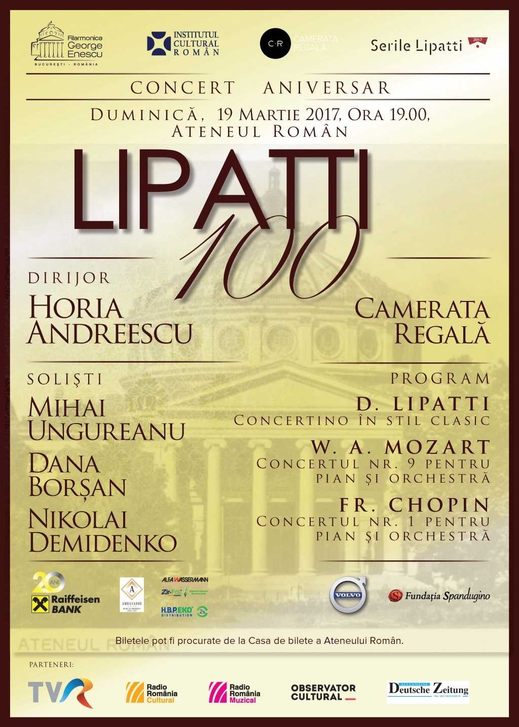 Duminică, 19 martie 2017, când se împlinesc 100 de ani de la naşterea pianistului şi compozitorului Dinu Lipatti (1917 – 1950), de la ora 19.00, la Ateneul Român- Sala Mare, va avea loc un concert extraordinar susţinut de Camerata Regală şi dirijat de maestrul Horia Andreescu. În program, lucrări de Dinu Lipatti ( ”Concertino in stil clasic pentru pian și orchestră de cameră”, op. 3, solist: Mihai Ungureanu), Wolfgang Amadeus Mozart (”Concertul nr. 9 pentru pian și orchestră”, Jeunehomme, KV 271, solistă: Dana Borşan)şi Frederic Chopin ( ”Concertul nr. 1 pentru pian și orchestră, op. 11, solist: Nikolai Demidenko).