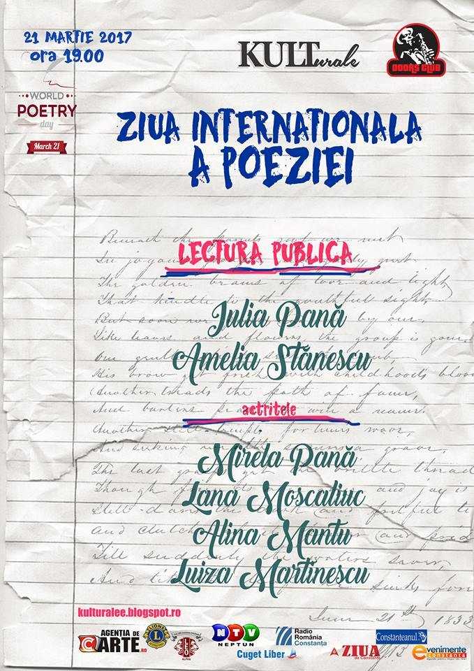 Marți, 21 martie 2017, ora 19.00, Doors Club din Constanța te invită la o degustare de poezie. Poetele Iulia Pană și Amelia Stănescu, alături de actrițele Mirela Pană, Lana Moscaliuc, Alina Manțu și Luiza Martinescu și-au propus să creeze pentru dumneavoastră o seară boemă, cu rimă sau fără rimă, pe texte proprii sau din lirica românească și internațională. AgențiadeCarte.ro este partener media al evenimentului.