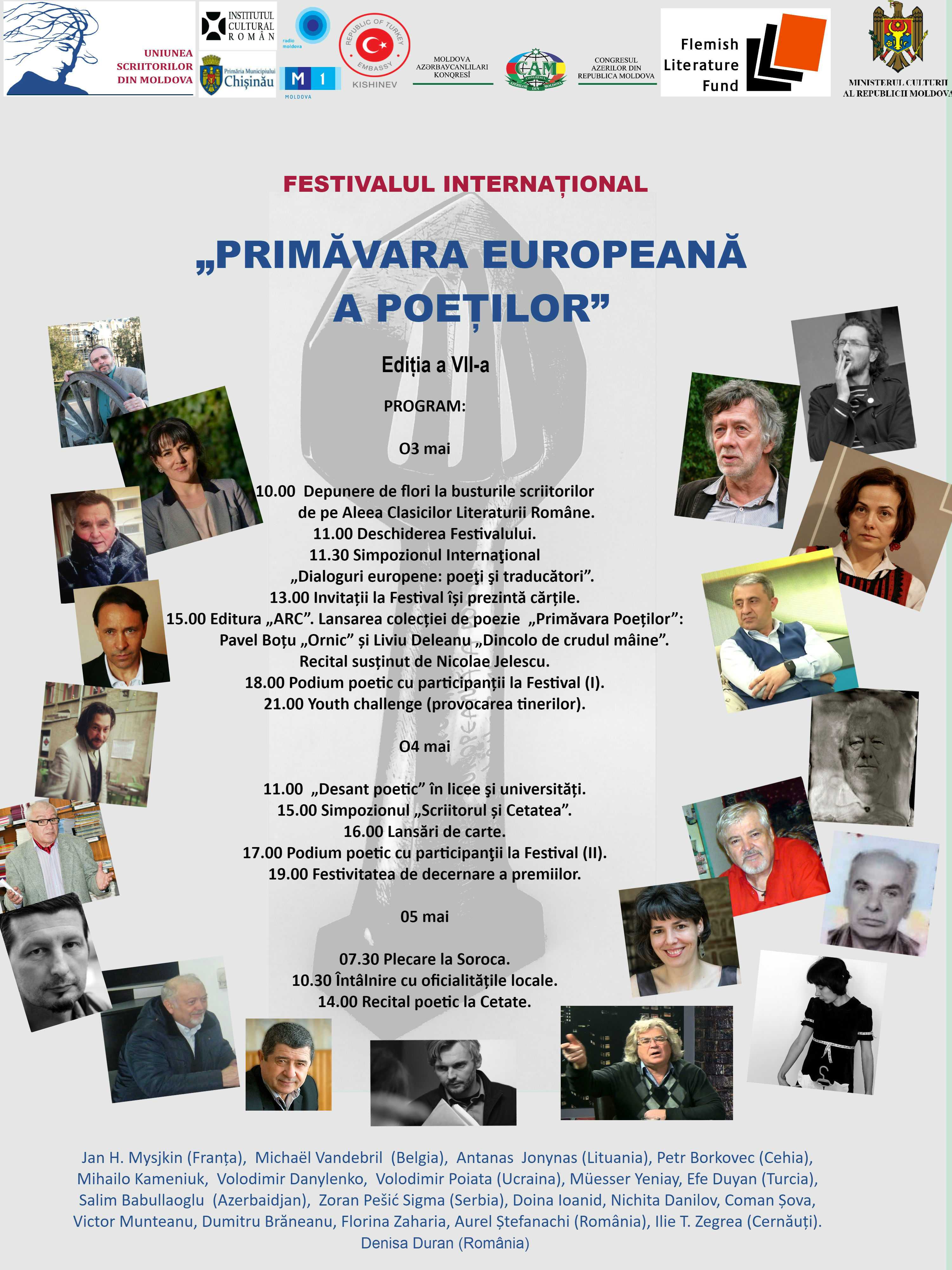 În perioada 3-5 mai 2017, Institutul Cultural Român „Mihai Eminescu” la Chișinău participă, în calitate coorganizator, la Festivalul Internațional „Primavara Europeană a Poeților”, organizat de Uniunea Scriitorilor din Republica Moldova. ICR Chișinau sprijină participarea în cadrul manifestărilor a următorilor invitați: Jan H. Mysjkin (Franța), Michael Vandebril (Belgia), Vladimir Poiata (Ucraina), Doina Ioanid, Florina Zaharia, Coman Șova, Victor Munteanu, Dumitru Brăneanu (Romania).
