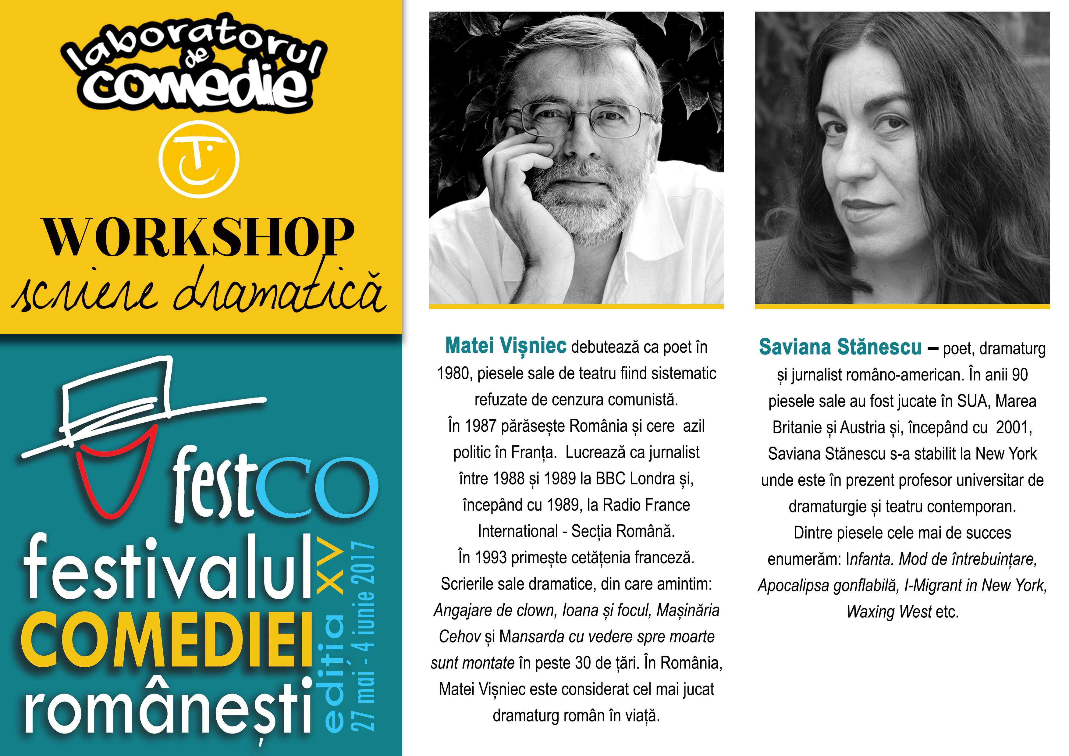 Teatrul de Comedie vă invită să participați – în cadrul Festivalului de Comedie Românească festCO ediția a XV-a, 27 mai – 4 iunie 2017 la câteva workshop-uri dedicate tinerilor actori și dramaturgi din România.