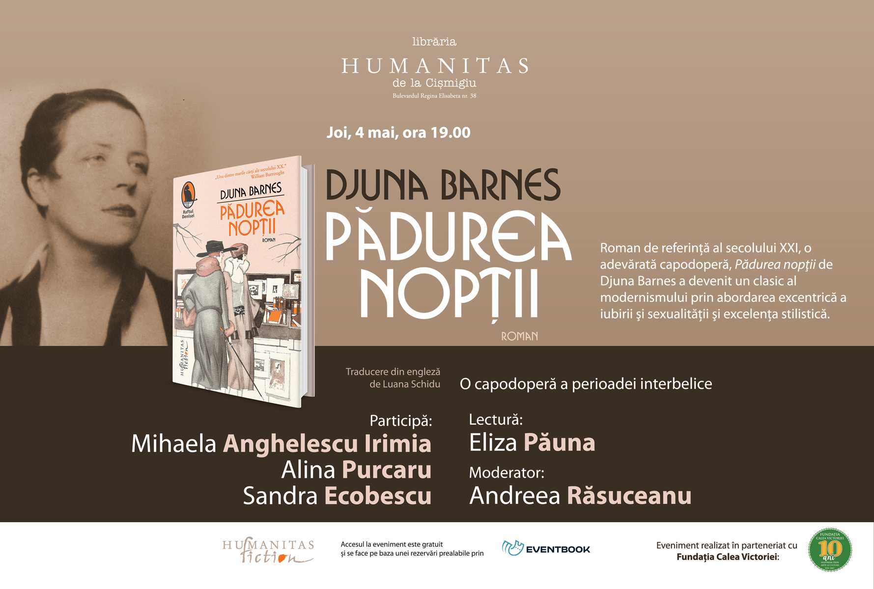Joi, 4 mai 2017, ora 19.00, la Librăria Humanitas de la Cişmigiu (Bld. Regina Elisabeta nr. 38), editura Humanitas Fiction vă aşteaptă la lansarea romanului ”Pădurea nopţii ” de Djuna Barnes, considerat de mari scriitori ca T.S. Eliot şi William Burroughs unul dintre cele mai importante romane din prima jumătate a secolului XX. La eveniment vor vorbi prof.dr. Mihaela Anghelescu Irimia, director de studii al Centrului de Studii Culturale Britanice patronat de Universitatea din Bucureşti şi Consiliul Britanic din Romania, Alina Purcaru, scriitoare şi critic literar şi Sandra Ecobescu, preşedinta Fundaţiei Calea Victoriei. Actriţa Eliza Păuna va citi fragment din roman. Andreea Răsuceanu, critic literar şi redactor Humanitas Fiction, va fi moderatorul întâlnirii.