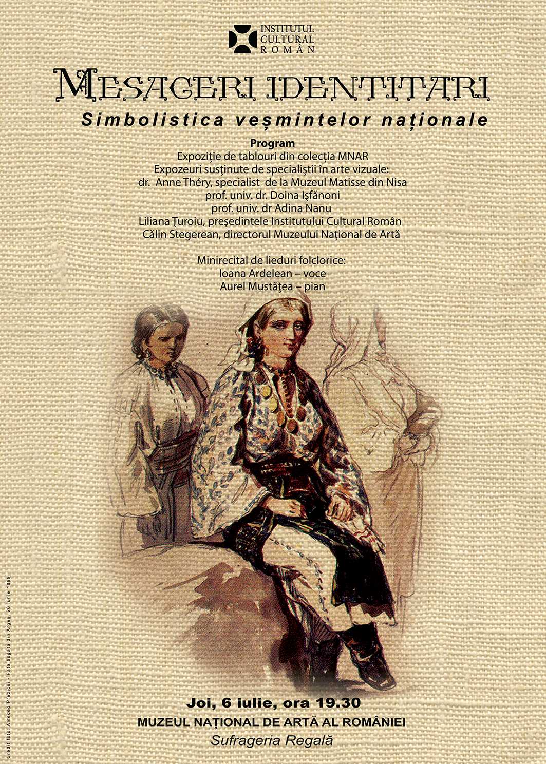 Joi, 6 iulie 2017, de la ora 19.30, Institutul Cultural Român organizează evenimentul „Mesageri identitari”, care va fi găzduit în Sufrageria Regală a Muzeului Național de Artă al României (Calea Victoriei nr. 49 – 53). Pornind de la o selecție de tablouri aflate în patrimoniul muzeului, în care sunt reprezentate personaje care poartă costume tradiționale românești, Institutul Cultural Român va organiza o serată dedicată simbolisticii veșmintelor naționale.