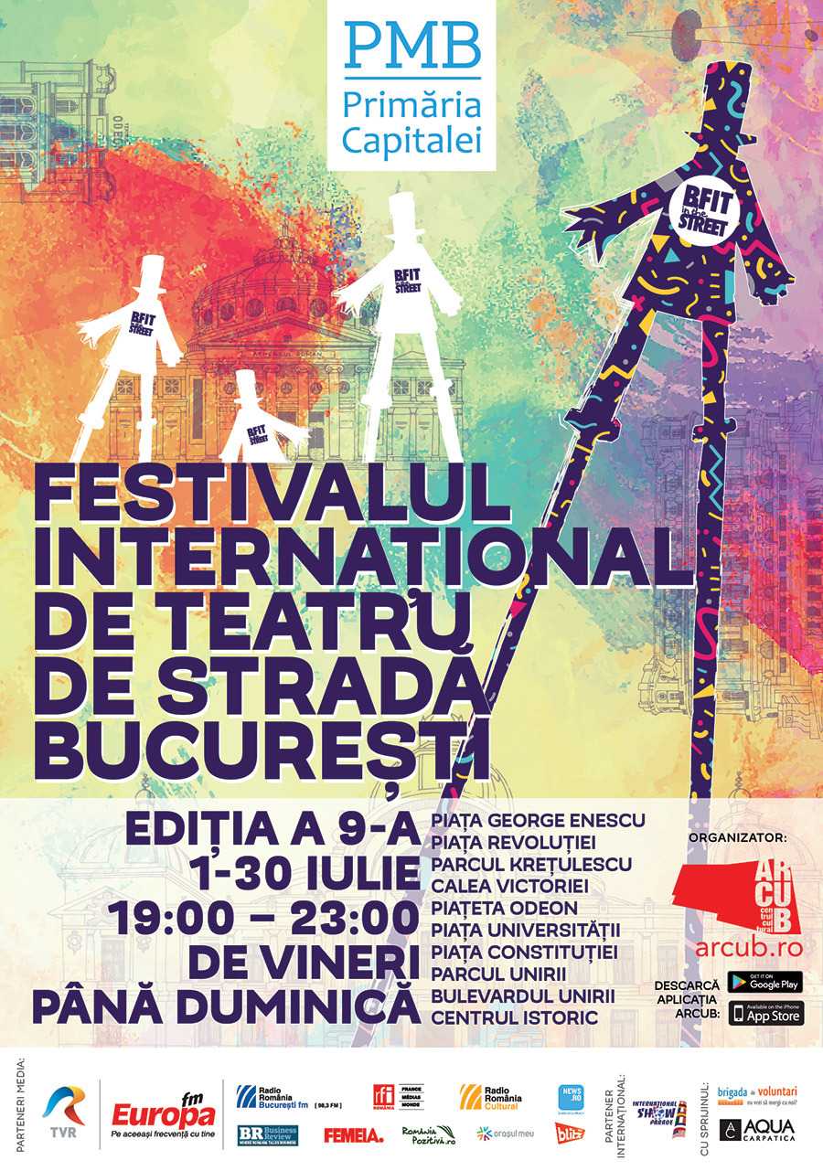 Primăria Capitalei, prin ARCUB, a marcat începutul sezonului estival, pe 1 și 2 iulie 2017, cu primul weekend al Festivalului Internațional de Teatru de Stradă București – B-FIT in the Street! Evenimentul a debutat la ora 19:00, în Parcul Unirii, unde pasionații de teatru de stradă au întâmpinat personajele fantastice, artiștii pe catalige și dansatorii unor companii de teatru din Italia. Acestea au pornit în paradă, spre Piața Constituției, unde seara s-a încheiat cu spectacole grandioase și momente emoționante. Osa Show, grandioasa producție a companiei Sonics, a ținut publicul cu sufletul la gură, cu numere captivante de acrobație la mare înălțime. În ultima parte a serii, Carillon 3.1 a dus spectacolul nocturn la un alt nivel. Suspendați la 80 de metri deasupra solului, artiștii trupei Kitonb au combinat dansul aerian cu acrobații executate la limită. Din programul zilei de 2 iulie amintim Sky Dance – Molecole Show, spectacolul nocturn prezentat în premieră în România, care a încheiat seara de duminică. Povestea de iubire a celor doi acrobați, care se înalță cu un mănunchi de baloane luminoase, pe acorduri muzicale, a uimit publicul din Piața Universității. Adrenalina și romantismul s-au împletit într-un număr care a combinat grația mișcărilor de dans și emoția zborului la zeci de metri deasupra publicului.