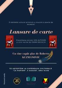 Sâmbătă, 5 august 2017, între orele 18:00 – 21:00, la cafeneaua La Papion (P-ța 1 Decembrie 1918 no. 1, 401094, Turda), va avea loc lansarea cărțiiCu tine capăt glas”, de Roberto Kuzmanovic. Va participa co-editorul revistei Vox Authors și criticul literar Mara Caloian care va vorbi despre poemele autorului în prima parte a evenimentului, după care ne vom delecta pe acorduri muzicale în compania Ioanei Racolța, iar apoi, împreună cu autorul, se va discuta detaliat despre revista cultural-artistică Vox Authors. În încheiere autorul va acorda autografe.