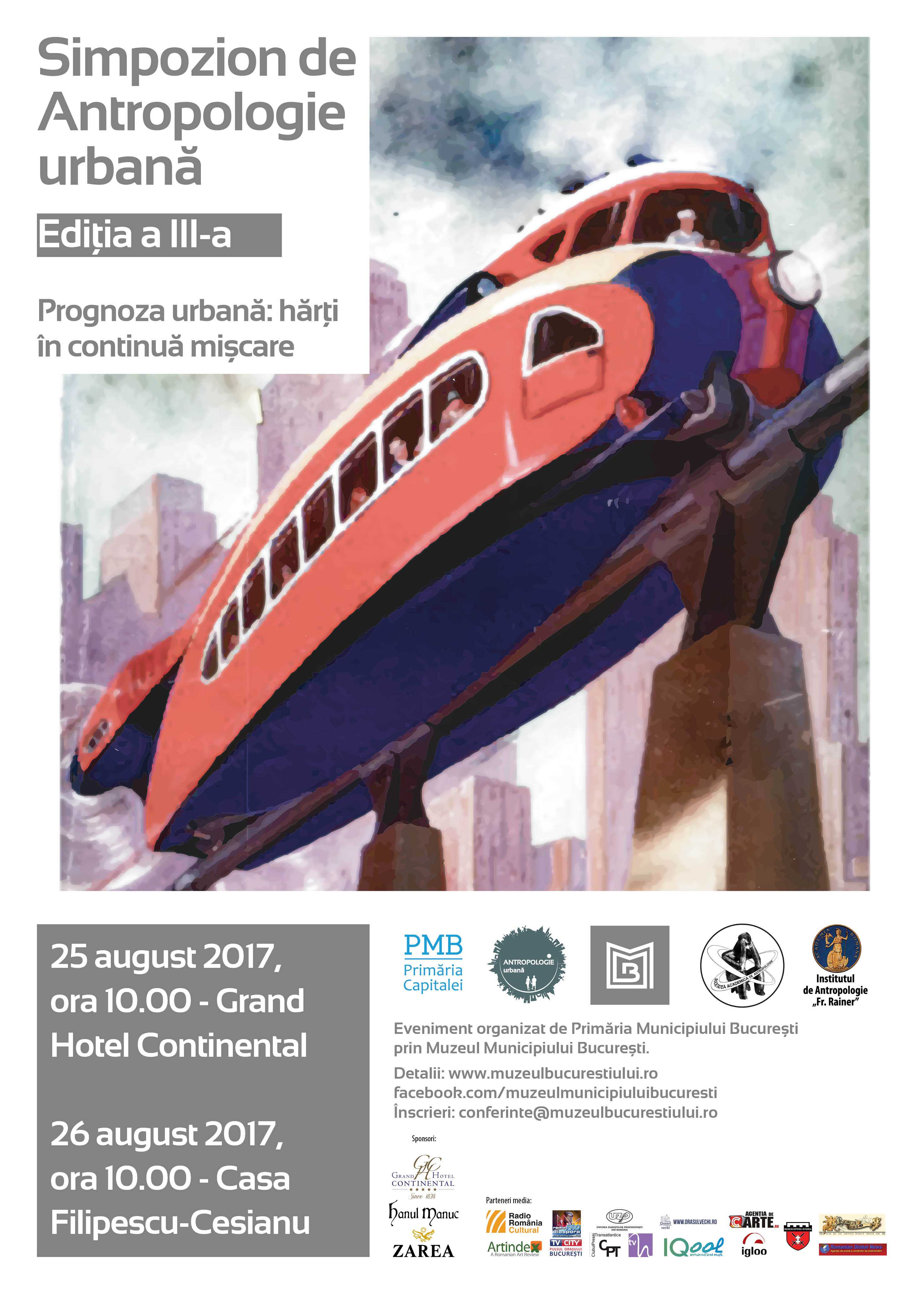 Vineri, 25 august și sâmbătă, 26 august 2017, Muzeul Municipiului Bucureşti, Institutul de Antropologie „Francisc I. Rainer” și Societatea Academică de Antropologie vă invită la Simpozionul de Antropologie urbană, ediția a III-a. Prezentările vor avea loc la Grand Hotel Continental și la Casa Filipescu – Cesianu.Vor fi dezbătute subiecte variate, legate de evoluția instituțională, schimbări culturale şi modificările percepției cetățenilor la nivelul națiunilor, factori de presiune asupra populației şi impactul creşterii economice asupra dezvoltării umane.Tema propusă pentru această ediție este cea a prognozei urbane: ce ne spun cercetările despre viitorul nostru în orașe, cum va arăta mediul nostru peste câteva decenii și cum se vor reconfigura barierele spațiului imaginar al hărților?