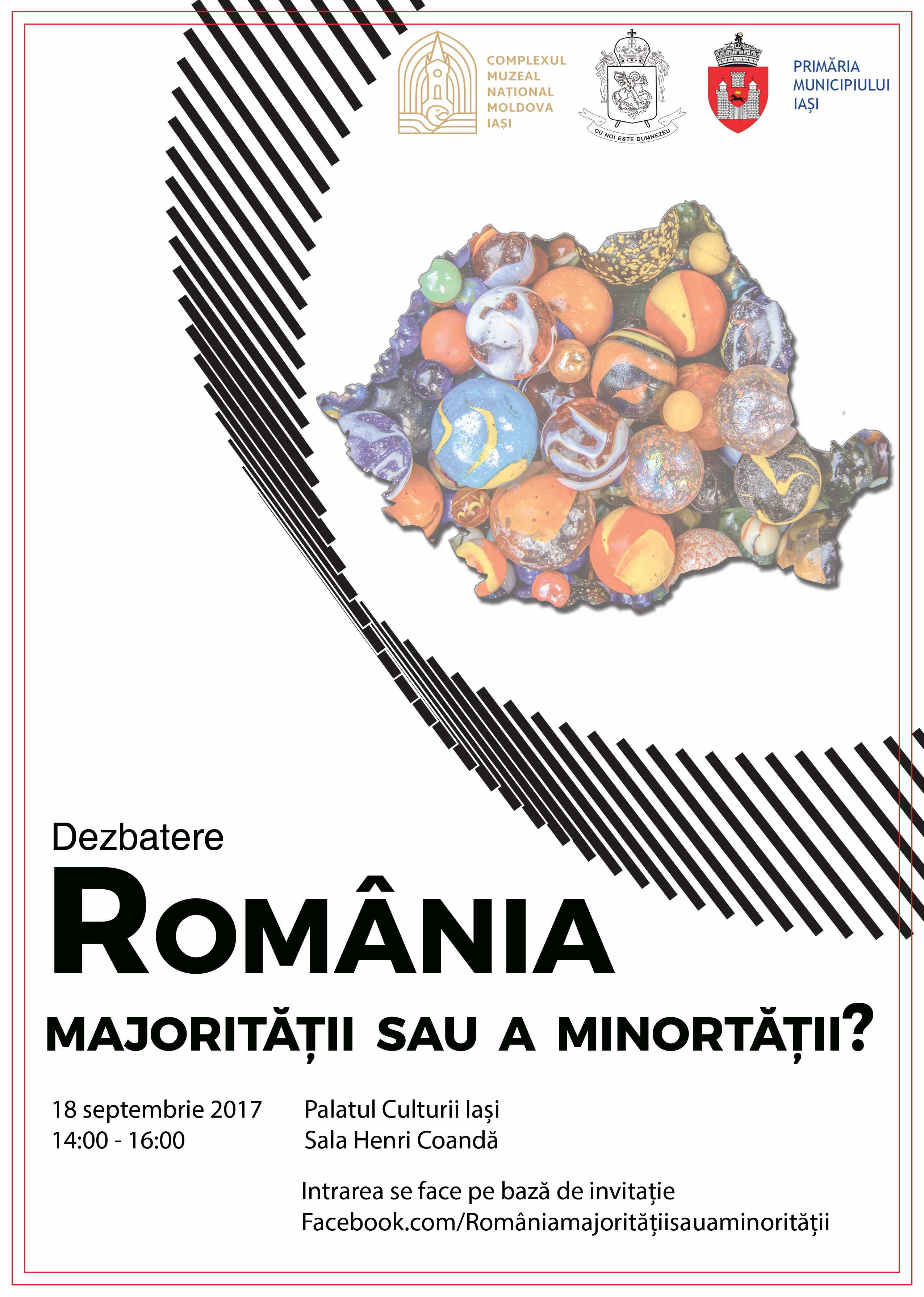 Luni, 18 septembrie 2017, în intervalul orar 14:00 – 16:00, va avea loc la Palatul Culturii din Iași, în sala Henri Coandă, dezbaterea ”România majorității sau a minorității? ”. Evenimentul este  organizat prin colaborarea a trei instituții ieșene: Primăria Municipiului Iași, Mitropolia Moldovei și Bucovinei (prin Departamentul pentru Minorități și Departamentul Pro Vita) și Complexul Muzeal Național Moldova Iași. La dezbatere vor fi invitați Dr. Sorin Iftimi, istoric și muzeograf la Palatul Culturii Iași, Lect. Univ. Dr. Constantin Iulian Damian, de la Facultatea de Teologie Ortodoxă „Dumitru Stăniloae” din Iași și reprezentanți ai Primăriei Municipiului Iași.