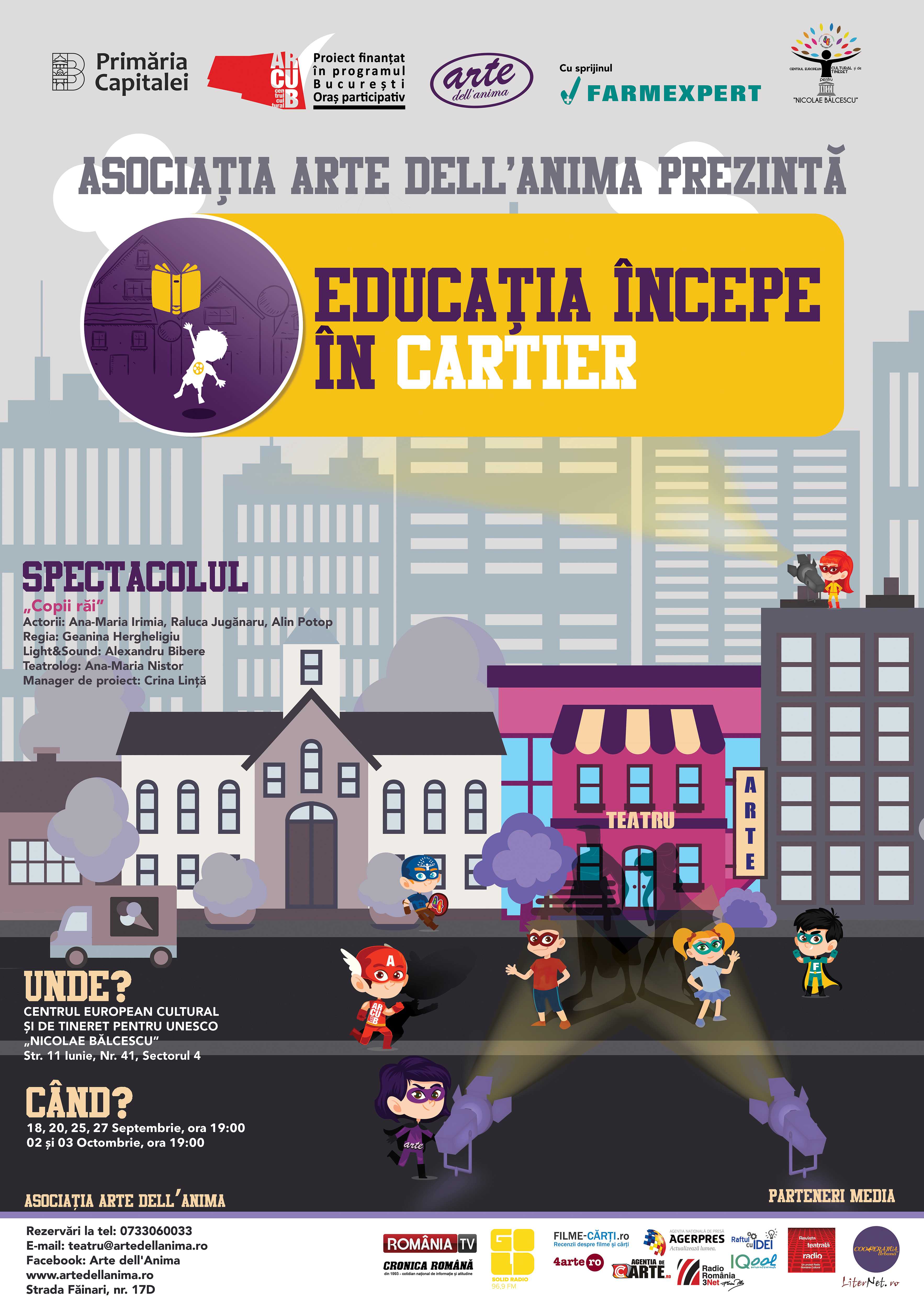 ”Educația începe în cartier este un proiect de teatru social ce include o serie de reprezentații pentru comunitate și pentru elevii din instituții de învățământ din sectorul 4, București, ale spectacolului Copii răi, de Mihaela Michailov, în regia Geaninei Hergheligiu. Distribuția este formată din Ana-Maria Irimia, Raluca Jugănaru și Alin Potop.