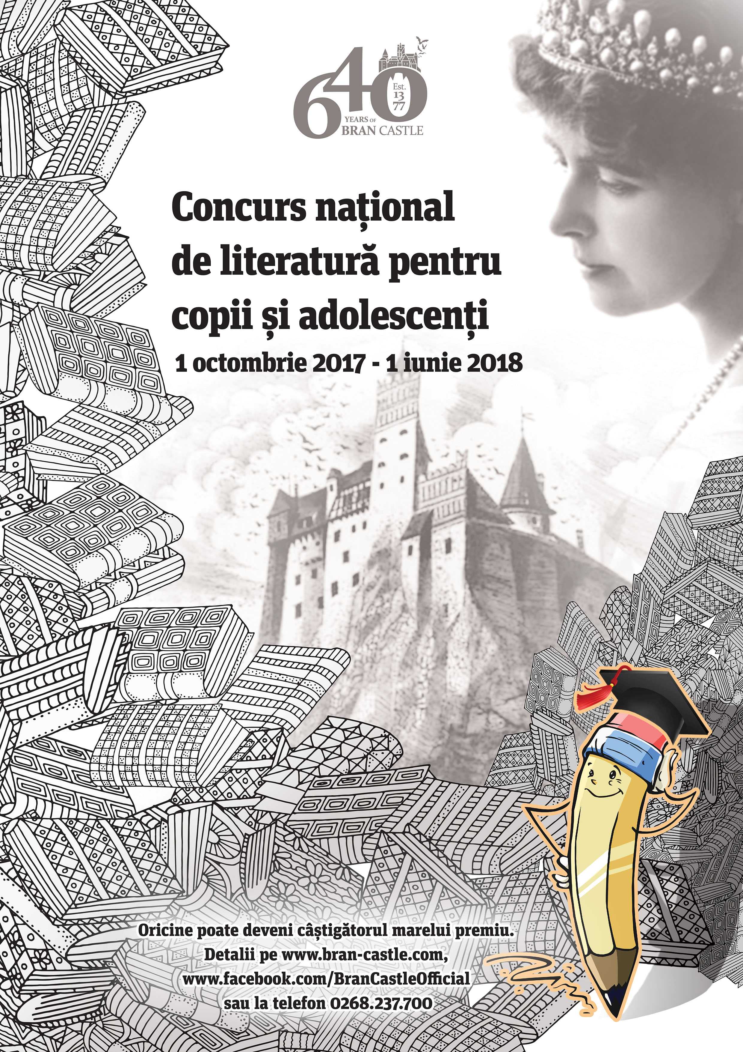 Castelul Bran anunță organizarea primei ediții a ”Concursului de literatură pentru copii și adolescenți”. ”Ești născută să scrii basme!”, i-a spus într-o zi Elisabeta mamei sale, Regina Maria. De aici, de la Castelul Bran, una din reședințele preferate ale Reginei Maria, preluăm îndemnul și vă spunem și noi: Sunteți născuți să scrieți, urmați-vă visul, îndrăzniți să împărtășiți cu lumea întreagă propria lume de lumină și culori. Lăsați cuvintele să prindă viață prin personaje imaginare sau reale, prin întâmplări cu haz și tâlc. Pentru ca cei mici care învață alfabetul, dar și cei care au ajuns la vârsta adolescenței să citească cu plăcere aventurile care prind viață prin ochii și inima dumneavoastră! O invitație ca o datorie de onoare pentru personalitatea Reginei Maria, cea care a scris, printre altele, „ca un prea plin de frumusețe al inimii”, povești pe care le citea propriilor copii. Povestiri reeditate an de an de Castelul Bran, în ediții bilingve, ilustrate cu desene ale elevilor de la liceele de artă din țară.