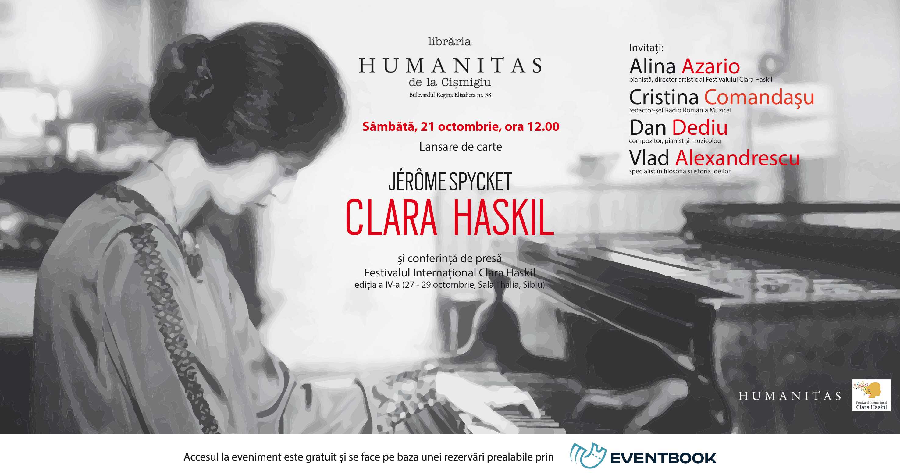 Sâmbătă, 21 octombrie 2017, la ora 12.00, Editura Humanitas și organizatorii Festivalului Internațional Clara Haskil le dau întâlnire melomanilor și iubitorilor de carte din București la Librăria Humanitas de la Cișmigiu pentru un dublu eveniment. Este vorba despre lansarea celei mai cunoscute biografii a Clarei Haskil, cartea semnată de muzicologul francez Jérôme Spycket, apărută, după 30 de ani, într-o nouă traducere la Editura Humanitas, și de conferința de presă dedicată ediției din acest an a Festivalului Internațional Clara Haskil (27-29 octombrie, Sala Thalia a Filarmonicii din Sibiu). Vor fi prezenți la eveniment: Alina Azario, pianistă și director artistic al Festivalului Clara Haskil, Cristina Comandașu, redactor-șef Radio România Muzical, Dan Dediu, compozitor, pianist și muzicolog, și Vlad Alexandrescu, specialist în filosofia și istoria ideilor.