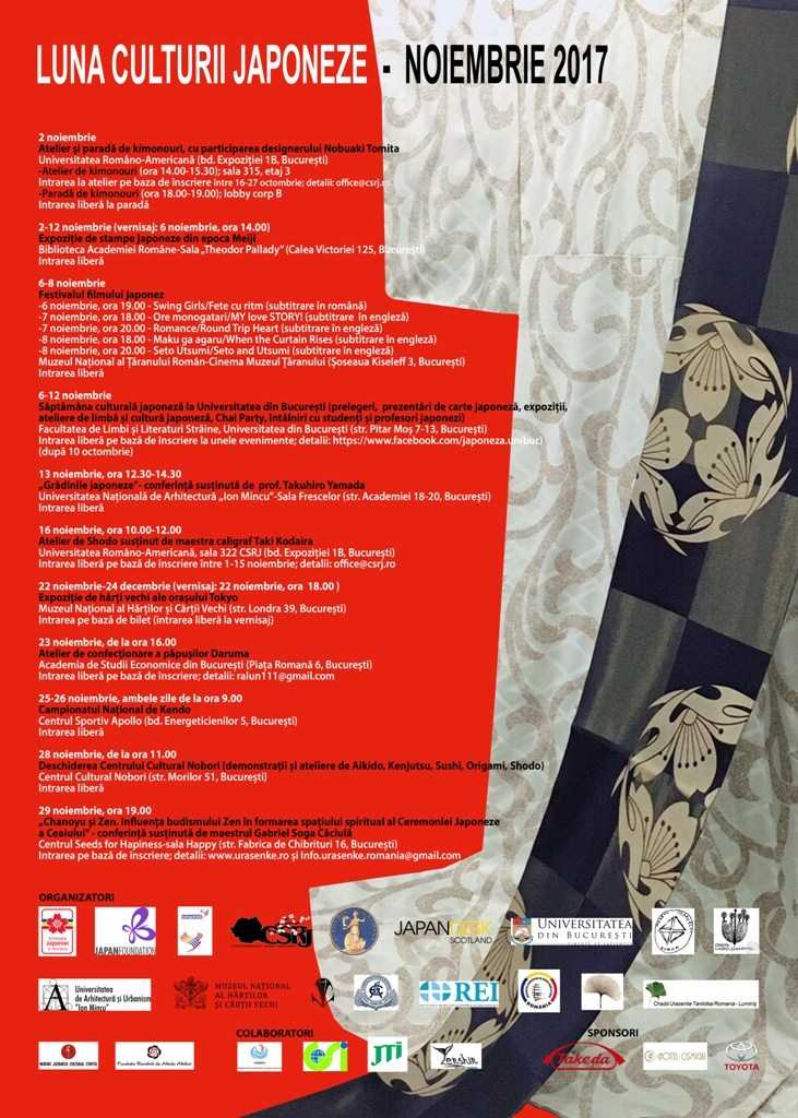 Ambasada Japoniei în România organizează, în luna noiembrie 2017, o amplă serie de evenimente culturale grupate sub egida LUNII CULTURII JAPONEZE. Ediția din acest an va cuprinde printre altele prezentări de kimonouri, proiecții de filme de lung metraj, expoziții de stampe și hărți japoneze vechi, ceremonii ale ceaiului, ateliere de caligrafie, origami, sushi, conferințe pe diverse teme, lansări de carte, competiții de aikido și kendo, etc. AgențiadeCarte.ro vă prezintă programul evenimentului.
