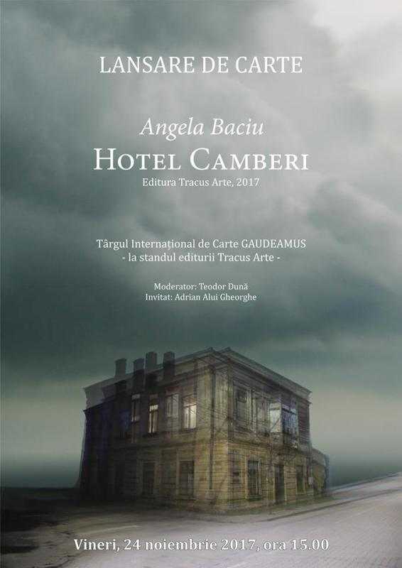 Vineri, 24 noiembrie 2017, ora 15.00, Editura Tracus Arte vă invită la lansarea cărtii ”HOTEL CAMBERI” de Angela BACIU, la standul editurii – în cadrul Târgului Internațional de Carte GAUDEAMUS, Bucuresti. Amfitrion: Teodor DUNĂ. Invitat: Adrian ALUI GHEORGHE.