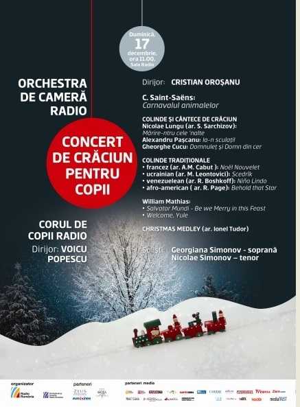 Duminică, 17 decembrie 2017, de la ora 11.00, Orchestra de Cameră Radio și Corul de Copii Radio aduc magia colindelor la Sala Radio, într-un concert de Crăciun pentru copii, cu intrare liberă. Inspirat deopotrivă de atmosfera Crăciunului și de copilărie, programul îi va cuceri cu siguranță pe cei mai mici spectatori: concertul va debuta cu Carnavalul animalelor, de C. Saint-Saëns, urmat de colinde românești și de cântece tradiționale de Crăciun din folclorul francez, ucrainian, venezuelean și afro-american.