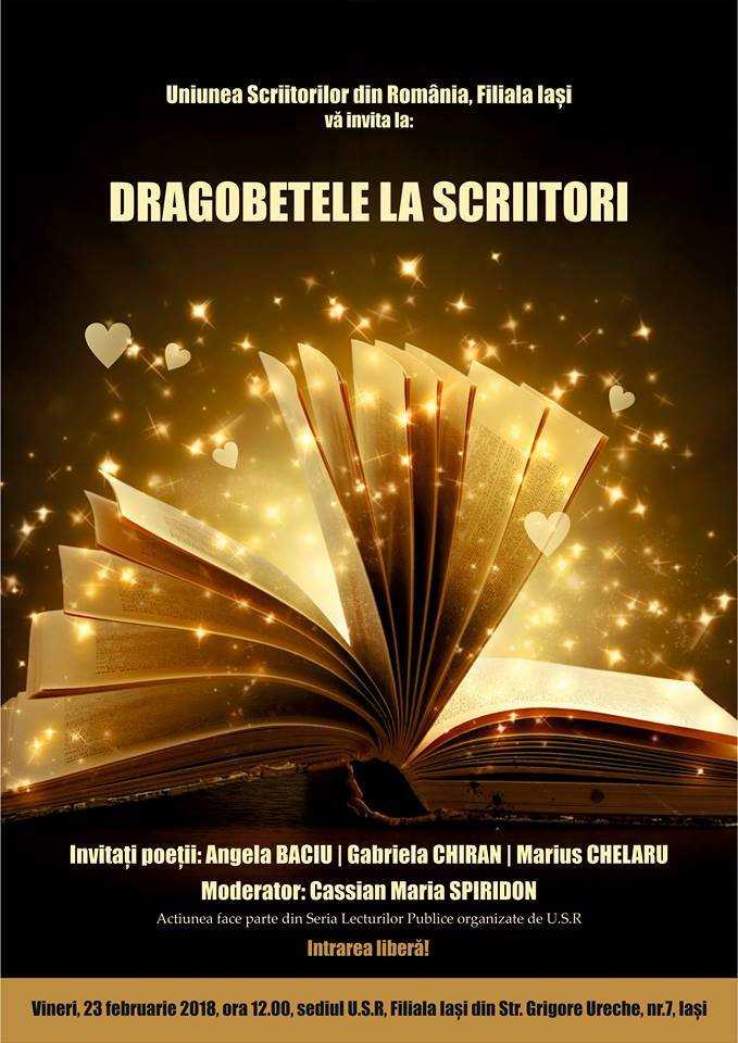 Vineri, 23 februarie 2018, ora 12.00, Uniunea Scriitorilor din România – Filiala Iași vă invită la evenimentul ”DRAGOBETELE LA SCRIITORI”. Invitați poeții: Angela BACIU, Gabriela CHIRAN, Marius CHELARU. Moderator: Cassian Maria SPIRIDON.