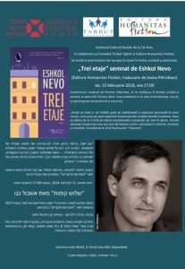 Institutul Cultural Român de la Tel Aviv, în colaborare cu Fundația Tarbut Sighet și Editura Humanitas Fiction, vă invită la evenimentul de lansare în Israel a traducerii în limba română a volumului Trei etaje, semnat de cunoscutul scriitor israelian Eshkol Nevo și publicat la Editura Humanitas Fiction în 2017, cu traducere și note de Ioana Petridean. Evenimentul, moderat de Peninah Zilberman, se va desfășura în limbile română și ebraică, joi, 15 februarie 2017, ora 17:00, la sediul ICR Tel Aviv (Blvd. Shaul HaMelech nr. 8, Beit Amot Mishpat, etaj 6), cu participarea extraordinară a autorului.