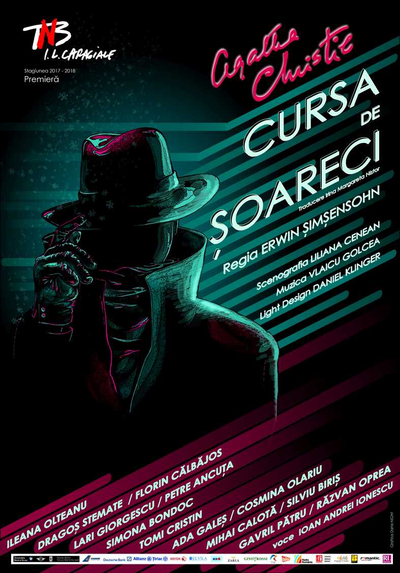 Joi, 15 și vineri, 16 februarie 2018, de la ora 19.00, la Sala Studio, Teatrul Naţional din Bucureşti anunţă premiera spectacolului ”Cursa de șoareci” de Agatha Christie. Cea mai longevivă piesă a tuturor timpurilor și genurilor, ”Cursa de șoareci” de Agatha Christie vă așteaptă, cu o distribuție dublă, alcătuită din îndrăgiţi actori ai TNB, să urmăriţi o poveste plină de suspans, ce îmbină umorul negru, situațiile-limită, emoția și jocurile întortocheate ale minții. Un irezistibil thriller clasic, ce se desfăşoară într-un decor elegant și atrăgător, realizat de binecunoscuta scenografă Liliana Cenean, şi în ambianţa sonoră imaginată de compozitorul Vlaicu Golcea, perfectă pentru a completa atmosfera şi a susţine tensiunea. Erwin Şimşensohn semnează regia acestei piese.