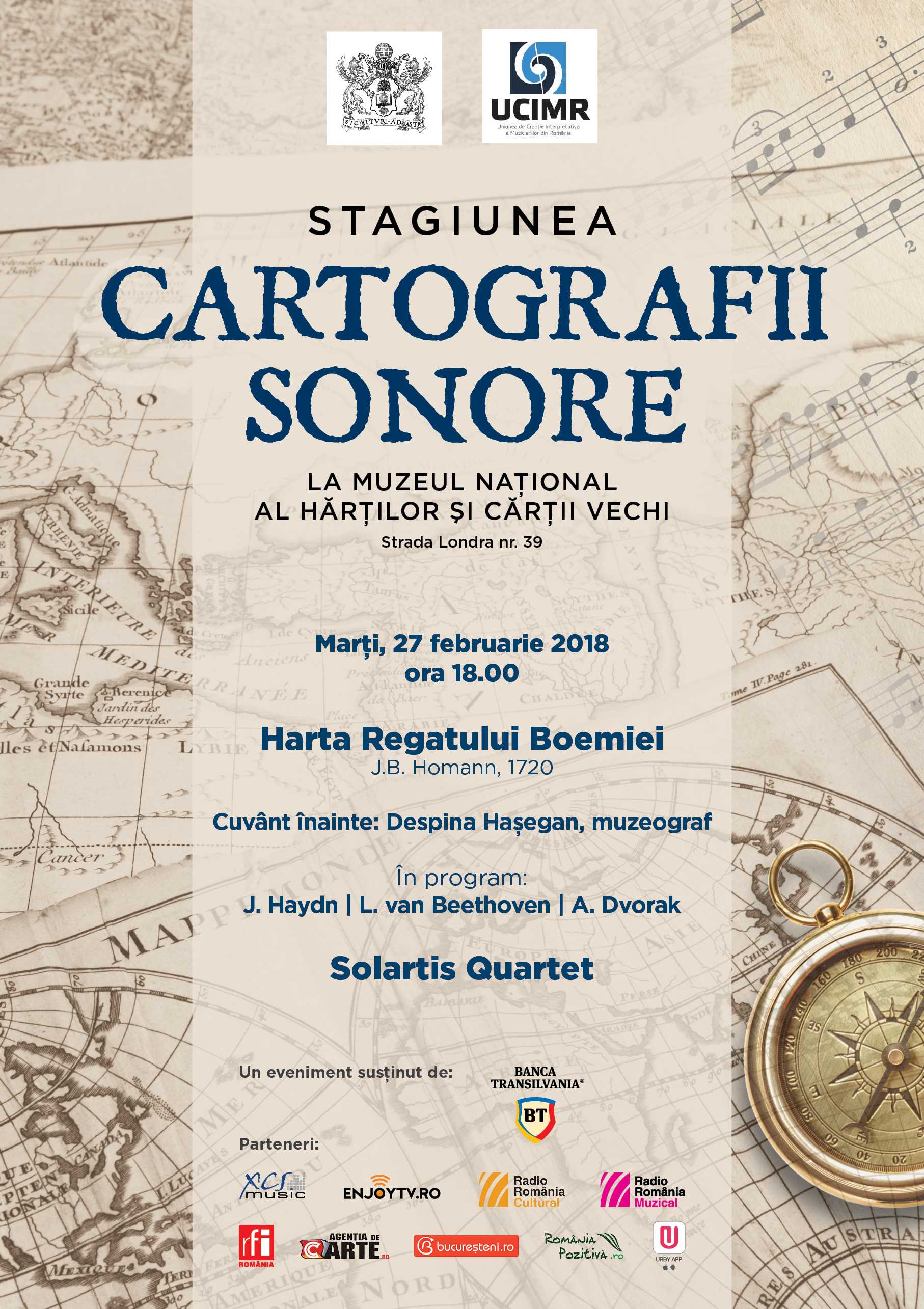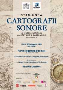 Și în 2018, la Muzeul Național al Hărților și Cărții Vechi, la fiecare final de lună muzica va dezvălui povestea unei hărți din vremuri îndepărtate. Marți, 27 februarie, de la ora 18:00, publicul este invitat în saloanele Muzeului din Strada Londra nr. 39 la deschiderea Stagiunii „Cartografii sonore” pe anul 2018. Invitat să concerteze va fi Solartis Quartet, cu un program ce va cuprinde lucrări de J. Haydn, L. van Beethoven și A. Dvořák, trei compozitori a căror biografie este corelată cu ținutul Boemiei istorice, tema acestui eveniment.