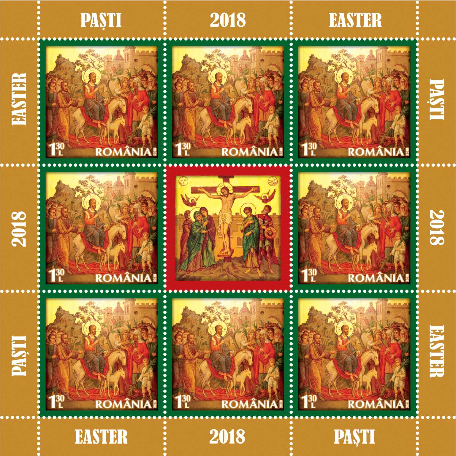 În apropierea celui mai important eveniment al creștinătății, Romfilatelia introduce în circulație emisiunea de mărci poștale Sfintele Paști 2018, care comemorează momente cruciale din viața lui Iisus HristosIntrarea în Ierusalim, Răstignirea și Învierea. Noua emisiune de mărci poștale va fi disponibilă începând de vineri, 9 martie 2018, în magazinele Romfilatelia din Bucureşti, Bacău, Braşov, Cluj-Napoca, Iaşi, Timişoara, precum şi în magazinul online: http://romfilatelia.ro/store/.