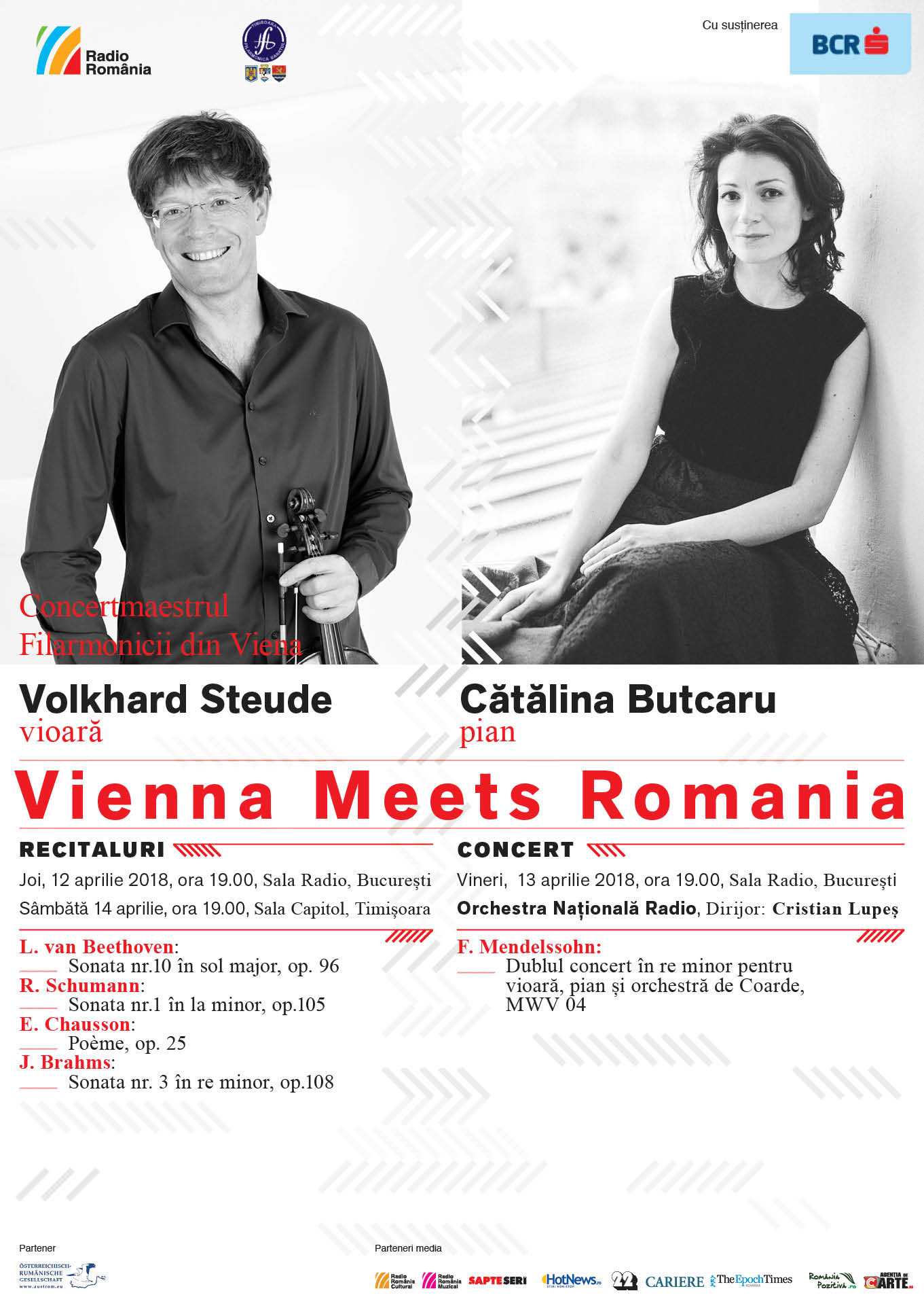 Săptămâna Luminată aduce o dată în plus bucurie melomanilor, căci Volkhard Steude, concertmaestrul Filarmonicii din Viena, și pianista Cătălina Butcaru, revin la București și Timișoara cu două recitaluri și un concert, cuprinse într-un program mai amplu, desfășurat pe o perioadă de cinci ani, intitulat Vienna Meets Romania. Volkhard Steude, cel care a putut fi ascultat în calitate de concertmaestru al Filarmonicii din Viena și la celebrul concert de Anul Nou 2018, cântă pe o vioară Antonius Stradivarius, care i-a fost pusă la dispoziție de Banca Națională a Austriei. Primul recital va avea loc pe scena Sălii Radio din București, joi, 12 aprilie 2018, de la ora 19.00 și al doilea la Timișoara, în cadrul Festivalului Timișoara Muzicală, pe 14 aprilie, la Sala Capitol, ora 19.00. Programul de anul acesta propune un itinerariu al sonorităților încărcate de melancolie, pasiune, mister, reverie, cuprinzând sonate de Beethoven, Schumann, Brahms și poemul de Chausson. AgențiadeCarte.ro este partener media al evenimentului.