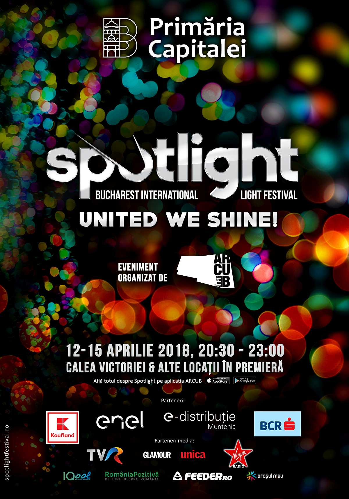 Joi, 12 aprilie 2018, ora 20:30, se dă startul celei de-a patra ediții Spotlight – Bucharest International Light Festival cu un spectacol de amploare susținut de două trupe internaționale în Piața George Enescu. Spotlight este singurul festival internațional al luminii din București și este organizat de Primăria Capitalei prin ARCUB. De la ora 20:30, zeci de mii de bucureșteni și turiști sunt așteptați să îi vadă pentru prima dată la București pe celebrii dansatori high-tech Light Balance din Ucraina, finaliști la emisiunea America’s Got Talent 2017. Una dintre cele mai căutate trupe ale momentului, Light Balance prezintă la Spotlight un spectacol elaborat de dans și lumini care a făcut senzație în Marea Britanie, Germania, Coreea de Sud, Arabia Saudită și China. Reprezentația Light Balance este precedată de spectacolul toboșarilor britanici Spark!, pe jumătate muzicieni, pe jumătate personaje futuriste cu costume și instrumente luminate de leduri. După evenimentul de deschidere instalațiile vor putea fi descoperite pe traseul principal dintre Biblioteca Centrală Universitară și Splaiul Independenței. În premieră au fost incluse în traseul Spotlight următoarele puncte strategice: Arcul de Triumf, Muzeul Național de Istorie Naturală Grigore Antipa, Palatul Știrbei, Ateneul Român, Ministerul Afacerilor Interne, Piața Universității, Teatrul Național București, Primăria Municipiului București. Cu noi clădiri și monumente din București incluse în premieră pe harta Spotlight, concursul internațional de video mapping la Palatul CEC și alte 27 de instalații, sesiuni de video mapping și proiecții arhitecturale din 11 țări, Spotlight schimbă pentru patru zile peisajul urban al Capitalei.