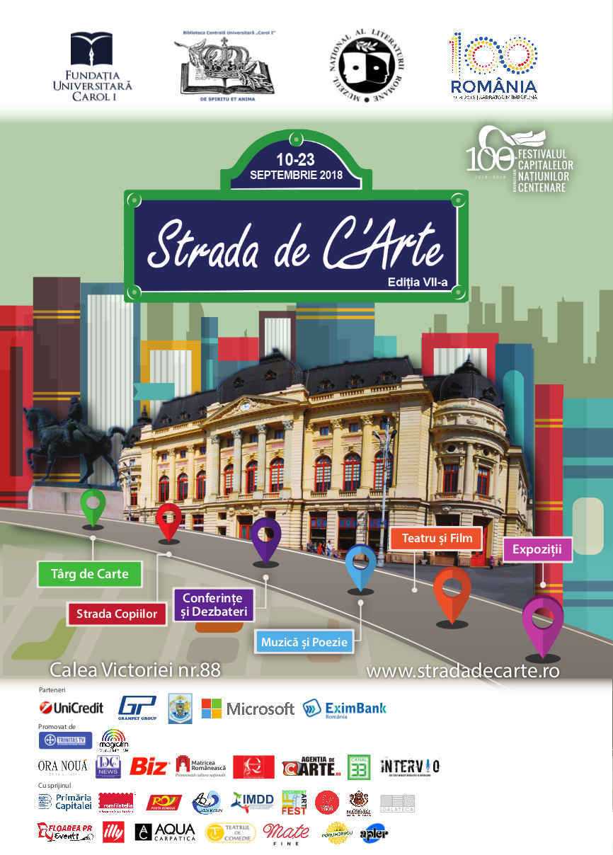 Biblioteca Centrală Universitară „Carol I” în parteneriat cu Fundaţia Universitară „Carol I” și Muzeul Național al Literaturii Române organizează ediția a VII-a a celui mai mare festival multicultural în aer liber: ”Strada de C’Arte”. Festivalul începe luni, 10 septembrie 2018, la ora 17:00 și se încheie duminică, 23 septembrie, după ora 20:00. Această îndrăzneață inițiativă va scoate în stradă cele șapte arte și le va înlesni întâlnirea cu un public larg, indiferent de vârstă sau venituri. În tot acest interval, participanții vor putea vizita o serie de expoziții printre care ,,Eroinele României Mari. Destine din Linia Întâi” și ,,Marele Război – un pas către Marea Unire”, vor putea participa la dezbateri, lecturi publice, spectacole de muzică și reprezentații teatrale, concerte, proiecții de film, lansări de carte, ateliere pentru copii, conferințe. Participarea este GRATUITĂ. Arealul statuii ecvestre a Regelui Carol I se va transforma în scenă pentru târgul de carte și va străluci grație „Asociaţiei Publicaţiilor Literare şi Editurilor din România”, dar și al unor concerte de excepție. Festivalul ”Strada de C’Arte” se adresează inclusiv celor mici, aceștia având parte de multe evenimente dedicate, pe Strada Copiilor, organizată în parteneriat cu „Institutul de Management și Dezvoltare Durabilă”. AgențiadeCarte.ro este partener media al evenimentului.