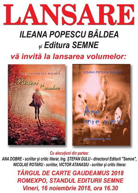 Vineri, 16 noiembrie 2018, ora 16.30, la „Târgul Internațional de carte GAUDEAMUS”, Pavilionul Central – Romexpo, standul Editurii Semne, va avea loc lansarea romanelor: „Păsări și umbre” și „Ape spre nimic” de ILEANA POPESCU BÂLDEA, cu alocuțiuni din partea: ANA DOBRE – scriitor și critic literar, Ing. STEFAN DULU – director Editura „Semne”, NICOLAE ROTARU – scriitor, VICTOR ATANASIU – scriitor și critic literar.