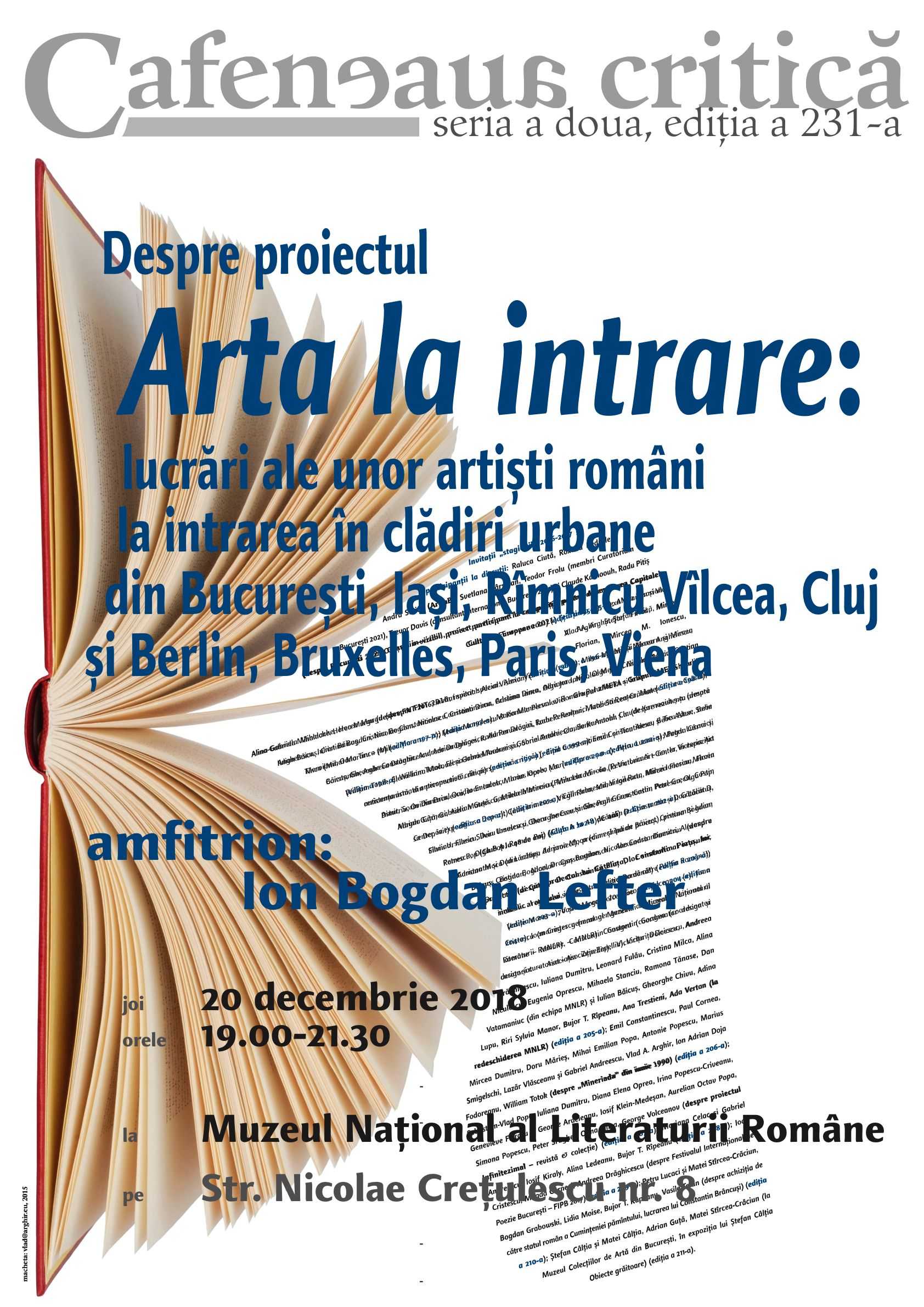 Joi, 20 decembrie 2018, orele 19.00-21.30, Muzeul Naţional al Literaturii Române din Bucureşti/ MNLR -Str. Nicolae Creţulescu nr. 8 (în spatele Bisericii Albe de pe Calea Victoriei şi în spatele UNITER), Cafeneaua critică propune o discuţie retrospectivă asupra ediţiei a doua a proiectului ”Arta la intrare”. Participă: Anca Boeriu (graficiană şi pictoriţă, manager de proiect), Andreea Sandu (coordonatoare a Galeriei Galateca), Ilina Schileru (graficiană şi artistă multimedia, membră a echipei de organizare), Andreea Drăghicescu (Muzeul Naţional al Literaturii Române), artişti participanţi în proiect, alţi membri ai echipei de organizare, critici de artă. Amfitrion: Ion Bogdan Lefter.