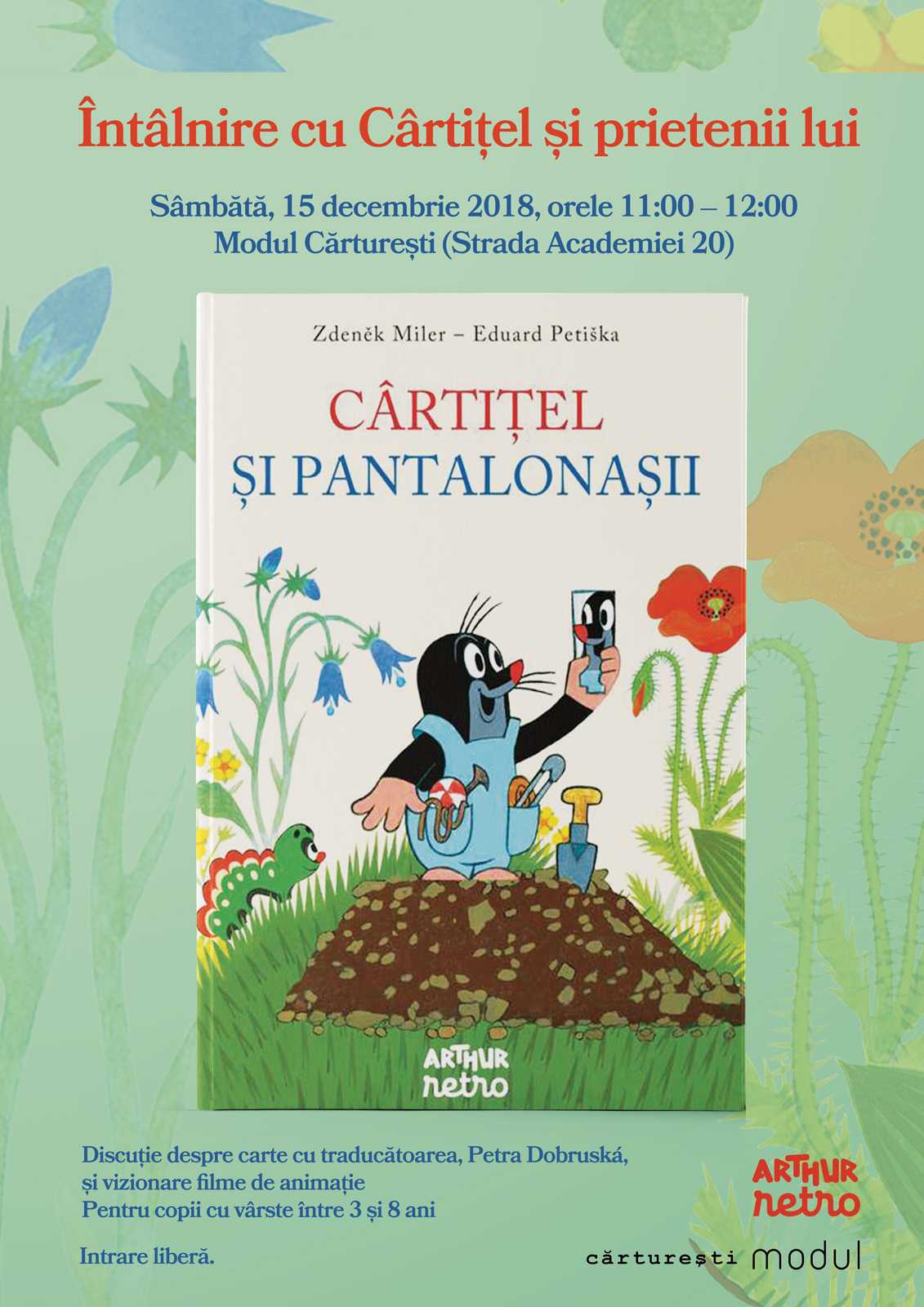 Sâmbătă, 15 decembrie 2018, orele 11:00 – 12:00, la librăria Modul Cărturești (Strada Academiei 20), editura Arthur vă dă întâlnire cu ”Cârtițel și prietenii lui”. Îl veți cunoaște pe adorabilul Cârtițel și vom vedea împreună un filmuleț de animație cu el și prietenii lui! Prezintă Petra Dobruská, cea care l-a tradus pentru prima dată în limba română pe legendarul Cârtițel. Eveniment recomandat copiilor cu vârste între 3 și 8 ani. Intrare liberă.