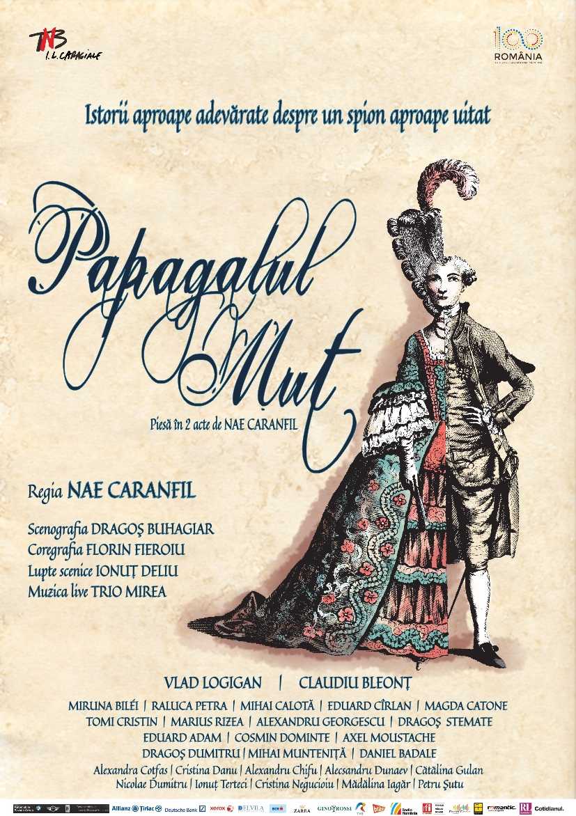 Papagalul mut – Istorii aproape adevărate despre un spion aproape uitat, piesă în două acte de Nae Caranfil, este o poveste incredibilă, dar reală, având în centru una dintre cele mai enigmatice şi fascinante figuri ale secolului al XVIII-lea. Pe numele său adevărat Charles-Geneviève-Louis-Auguste-André-Thimothée d’Eon de Beaumont, spionul travestit Charles d’Eon/ Lia de Beaumont, cunoscut în istorie drept Cavalerul d’Eon, a trăit jumătate din viaţă ca femeie. Mai exact, 33 de ani din viaţă i-a trăit travestit în femeie şi alţi 49 ca bărbat, derutând lumea, intrigând-o, seducând-o şi obţinând aproape întotdeuna avantaje personale cât se poate de substanţiale. Fiinţă ambivalentă, trădător uneori, alteori sălbatic, dar credincios regelui său Ludovic al XV-lea, el a intrat în legendă ca primul dintre agenţii secreţi ai istoriei Franţei.