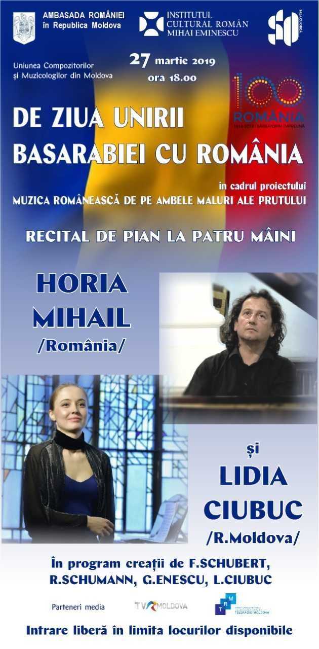Institutul Cultural Român „Mihai Eminescu” la Chișinău, în colaborare cu Ambasada României în Republica Moldova, organizează pe data de 27 martie 2019, ora 18.00, la Sala cu Orgă, un concert de muzică clasică pentru a marca împlinirea  a 101 ani de la Unirea Basarabiei cu România.