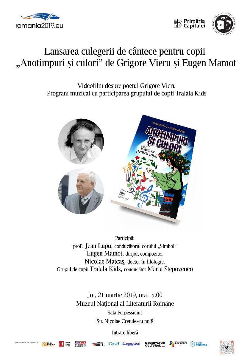 Joi, 21 martie 2019, ora 15.00, la sediul MNLR din Strada Nicolae Crețulescu 8, Muzeul Național al Literaturii Române vă așteaptă la evenimentul de lansare a culegerii de cântece pentru copii „Anotimpuri și culori” (Editura Arc, Chișinău, 2018) de Grigore Vieru și Eugen Mamot. Întâlnirea, moderată de compozitorul culegerii, Eugen Mamot, va avea loc în prezența profesorului Jean Lupu, fondatorul și dirijorul corului „Symbol”, și a filologului Nicolae Mătcaș.Va fi proiectat un film despre poetul Grigore Vieru, iar grupul de copii „Tralala Kids”, de la Școala de muzică „Tralala School” din București, conducător Maria Stepovenco, va susține un mic recital. AgențiadeCarte.ro este partener media.
