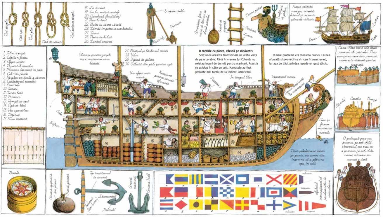Noua carte are 48 de pagini şi se împarte în mai multe capitole: Cele mai vechi forme de bărci • Povestea lui Ulise • Corăbiile vikingilor • Marile descoperiri geografice • Monștri marini • Corsari și pirați • Viața marinarilor • În primejdie pe mare • Tipuri de nave • Scufundarea • Navigația pe râuri.