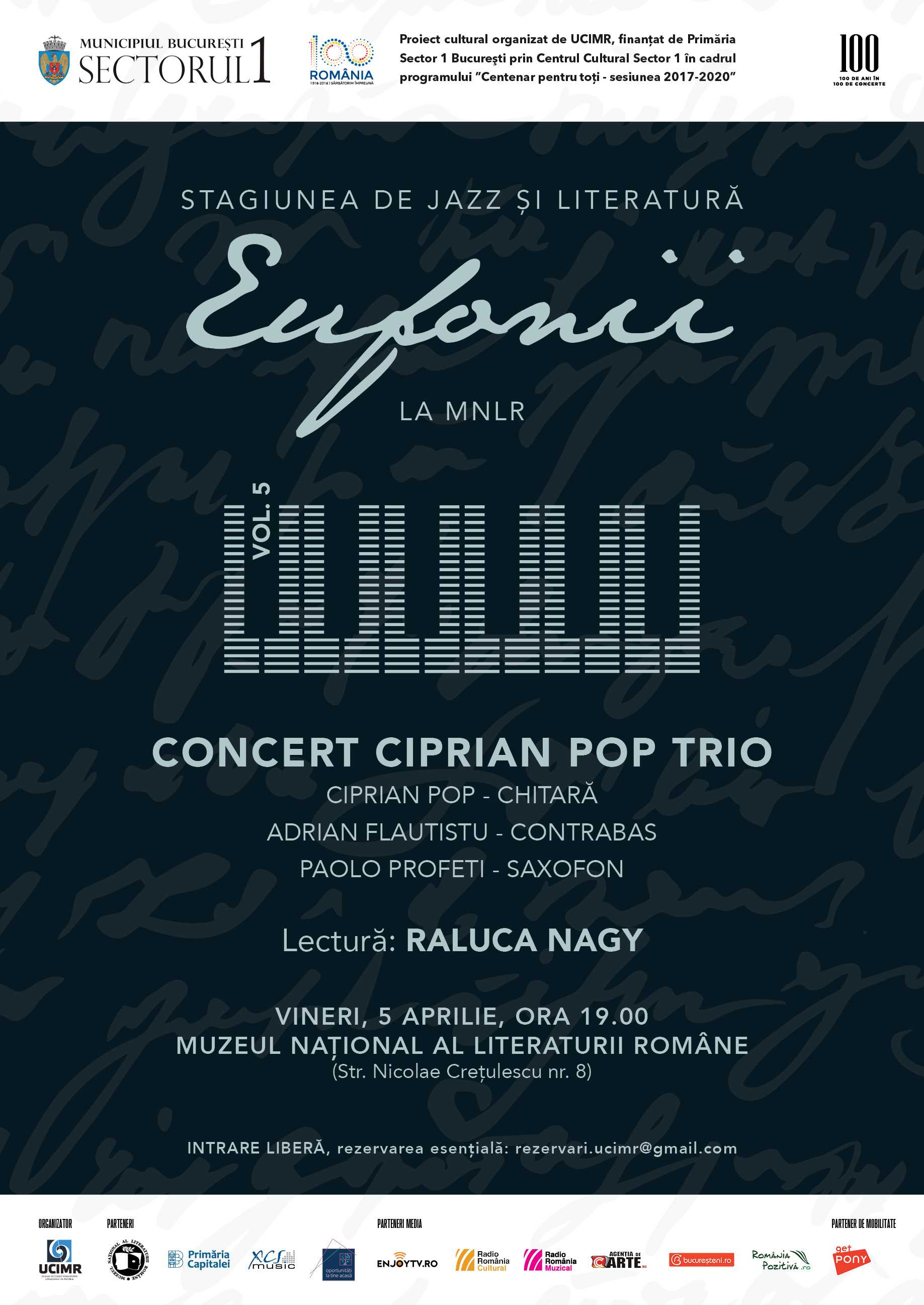 Vineri, 5 aprilie 2019, de la ora 19:00, la Muzeul Național al Literaturii Române, stagiunea „Eufonii la MNLR” pregătește o nouă surpriză fanilor muzicii de jazz, dar și iubitorilor de literatură contemporană. După succesul Volumului 4 al Stagiunii, când membrii formației Andrei Petrache Trio au interpretat o selecție de standarde jazz din perioada interbelică, iar scriitorul Florin Iaru a susținut un adevărat spectacol de lectură, Vol. 5 propune o nouă experiență culturală redată de sensibilitatea muzicii de jazz ascultate în consonanță cu o poveste seducătoare și polisenzorială spusă de Rosalyn. Invitați vor fi membrii formației Ciprian Pop Trio, conduse de unul dintre cei mai apreciați chitariști jazz ai momentului, și autoarea Raluca Nagy care va citi din romanul său, „Un cal într-o mare de lebede” (colecția „n’autor”, Editura Nemira, 2018), apariție editorială distinsă cu numeroase aprecieri din partea cititorilor și a criticii de specialitate. AgențiadeCarte.ro este partener media al evenimentului.