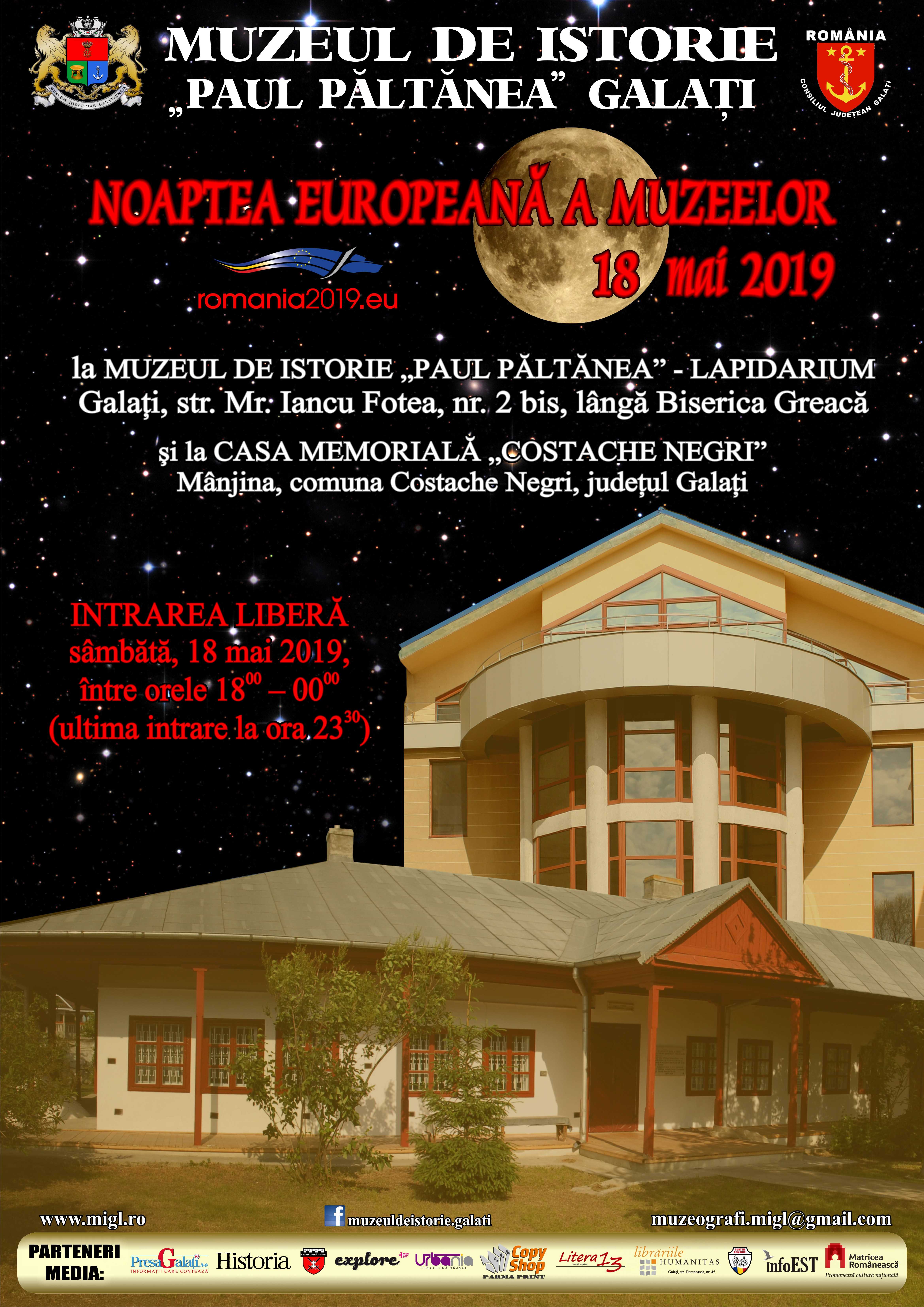 Sâmbătă, 18 mai 2019, începând cu ora 1800, Muzeul de Istorie „Paul Păltănea” Galaţi vă aşteaptă să participaţi la evenimentul cultural NOAPTEA EUROPEANĂ A MUZEELOR.