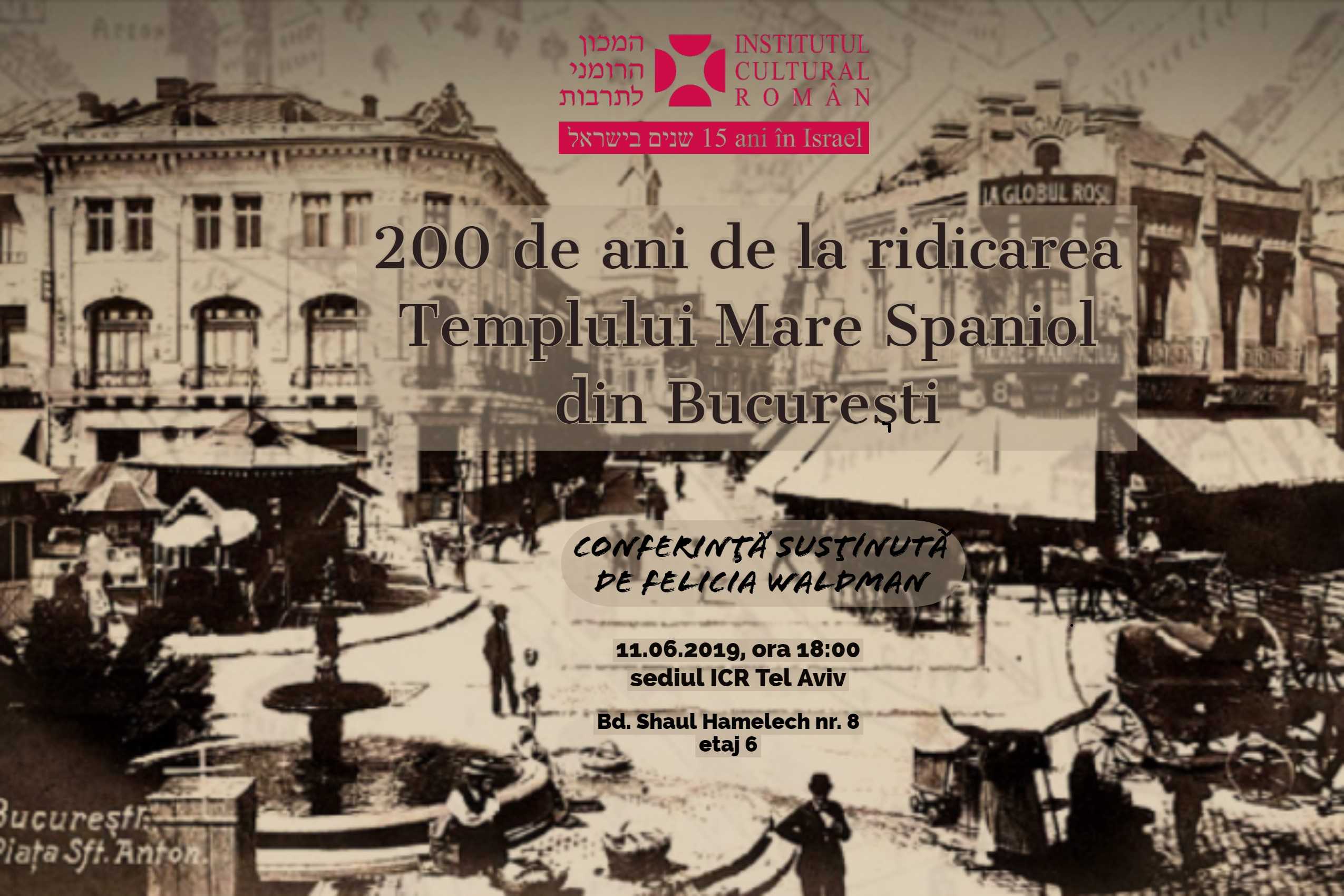 Marți, 11 iunie 2019, Institutul Cultural Român de la Tel Aviv va organiza și găzdui conferința susținută de dr. Felicia Waldman, intitulată „200 de ani de la ridicarea Templului Mare Spaniol din București”. În completarea acesteia, pe 12 iunie, dr. Waldman va susține, la sediul Institutului Cervantes din Tel Aviv (str. Ha’Arba nr. 28), conferința „Sefarzii Bucureșteni și legătura lor cu Spania”, în limba engleză. Ambele evenimente vor începe la ora 18:00.