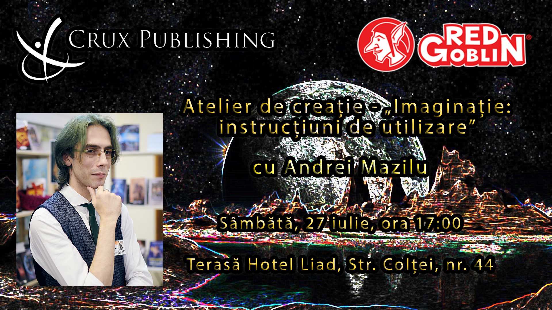 Fidelă misiunii sale de a promova lectura și de a le oferi tuturor cititorilor și scriitorilor posibilitatea de a-și dezvolta imaginația, creativitatea și abilitățile de povestitori/scriitori, editura Crux Publishing*, în asociere cu Red Goblin – Magazinul de jocuri, organizează sâmbătă, 27 iulie, de la ora 17.00, la Hotel Liad în București (Str. Colței, nr. 44), o nouă întâlnire cu un autor român contemporan, în cadrul unui atelier de creație.