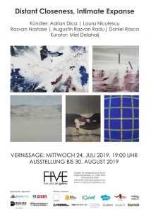 Luna trecută a avut loc la galeria Five Plus din Viena vernisajul expoziției de grup „Distant Closeness, Intimate Expanse” curatoriată de Miel Delahaij, care a adus împreună lucrări de pictură semnate de Adrian Dică, Răzvan Năstase, Laura Niculescu, Augustin Răzvan Radu și Daniel Roșca. Cei cinci artiști alcătuiesc GRUND – o comunitate artistică deschisă, mai de grabă decât un grup artistic cu misiune și statement – iar aceasta este prima lor expoziție în formulă completă. Fiecare are desigur și un parcurs artistic individual, iar o parte din ei a mai expus în acest spațiu expozițional concentrat pe arta românească, situat pe Argentinierstrasse, nr. 41, chiar lângă Institutul Cultural Român de la Viena. Însoțită de un catalog bilingv, expoziția explorează noțiunea de spațiu, reunind abordări diferite ale tematicii, în ceea ce privește stilul și cromatica.