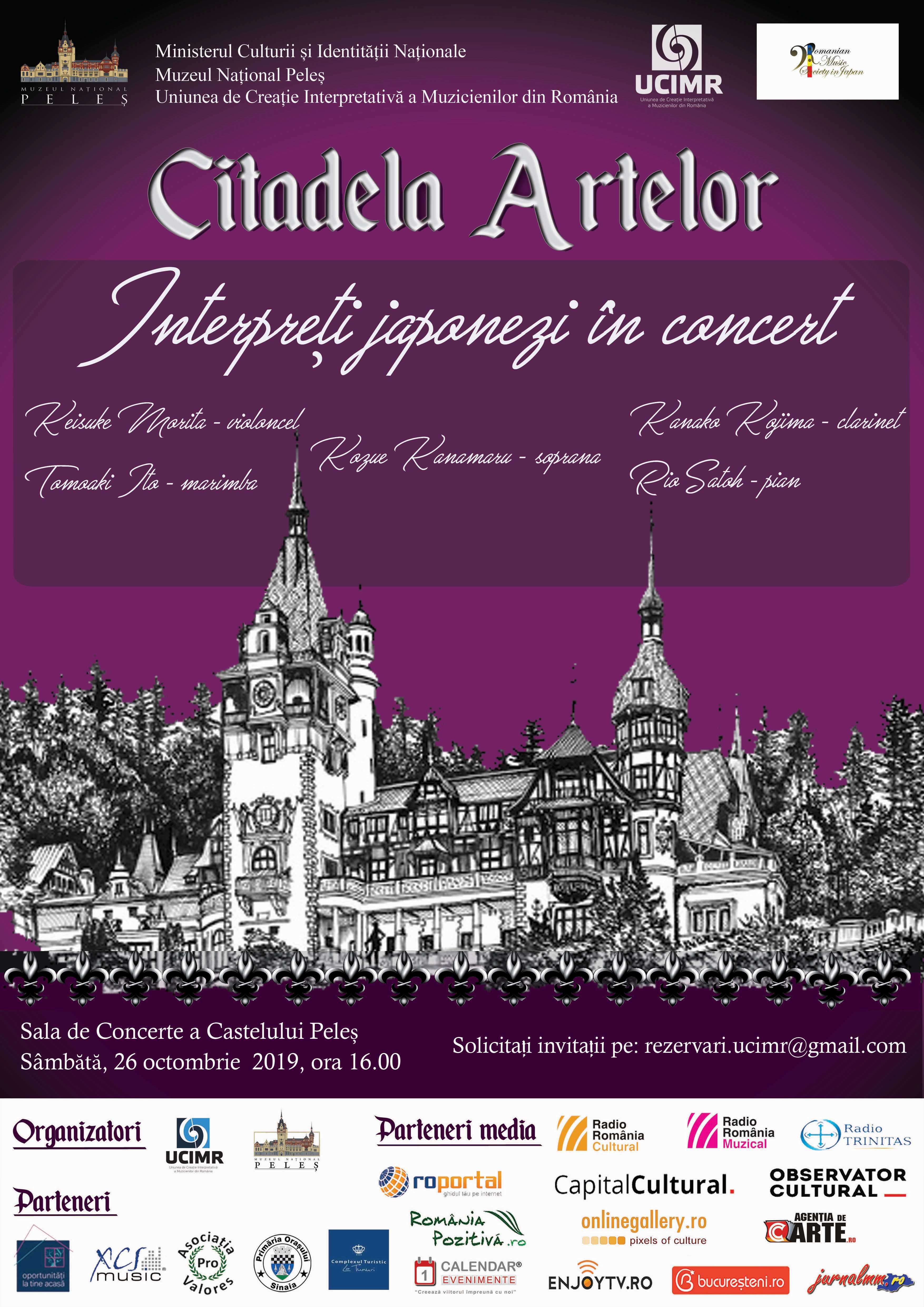 Stagiunea „Citadela Artelor” de la Sala de concerte a Castelului Peleș continuă sâmbătă, 26 octombrie 2019, de la ora 16:00, cu invitați de excepție din Japonia, țara care a propulsat pe marile scene ale lumii numeroși interpreți de valoare internațională. Concertul va fi susținut de laureații Concursului Romanian International Music Competition in Japan: Keisuke Morita – violoncel, Tomoaki Ito – marimbă, Kanako Kojima – clarinet, Rio Satoh – pian și soprana Kozue Kanamaru. Programul ales va urmări o paralelă între muzica clasicilor Mozart, Strauss sau Brahms și cea modernă, prin lucrări semnate de Nebojsa Jovan Zivkovic sau Shisido Mutsuo. Vizitatorii vor putea descoperi, cu acest prilej, un nou obiect de colecție din patrimoniul Muzeului Național Peleș a cărui istorie va fi expusă în deschiderea concertului. Evenimentul este organizat în parteneriat cu Romanian Music Society in Japan și va fi prezentat de jurnalistul Sebastian Crăciun. AgențiadeCarte.ro este partener media.