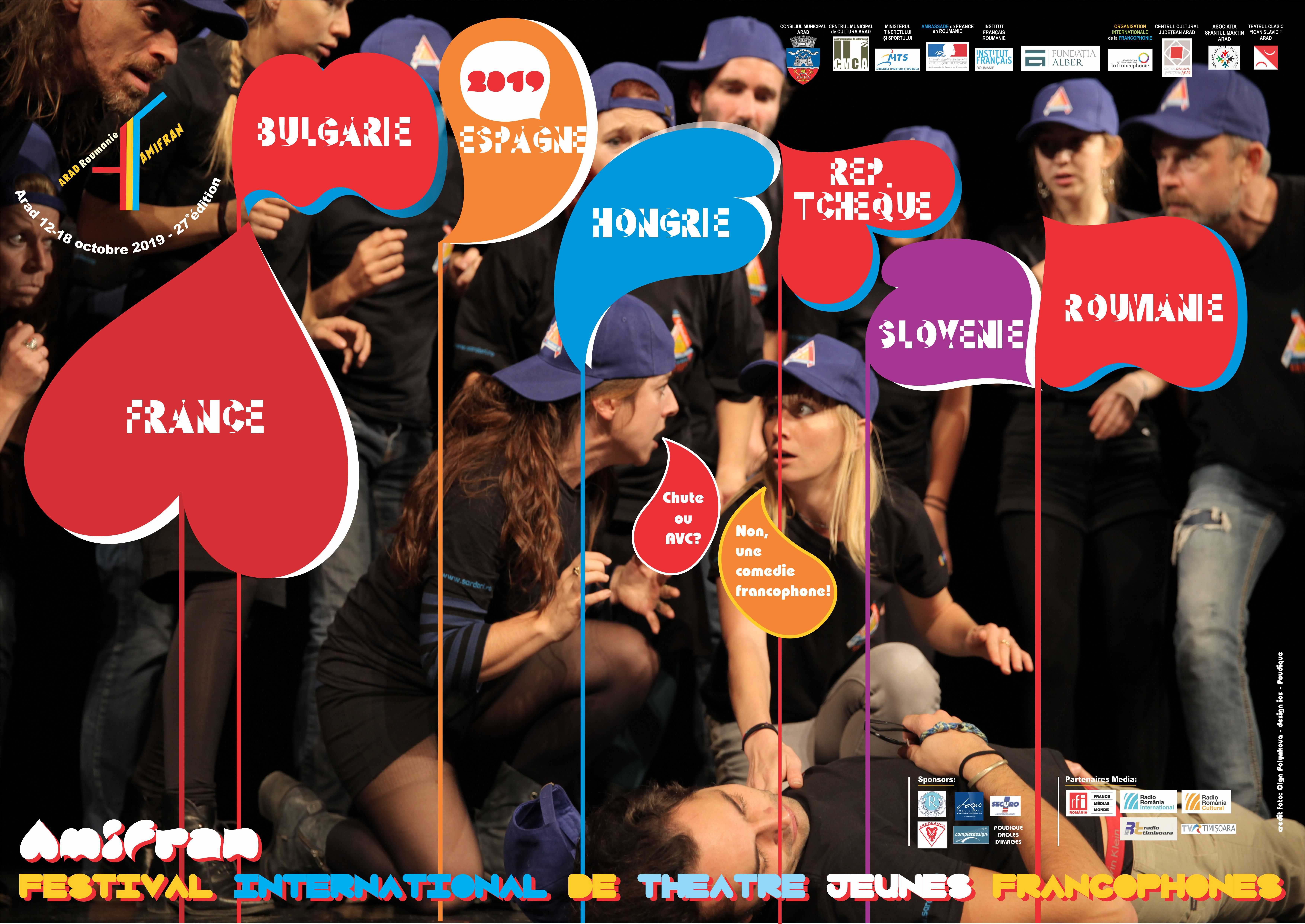 Din țară vor urca pe scena Teatrului Clasic « Ioan Slavici » din Arad francofoni din București (Liceul « Dimitrie Bolintineanu și Liceul Francez «Anna de Noailles »), din Baia Mare, Bistrița, Cluj-Napoca, Constanța, Dej, Huedin, Iași, Sighetu Marmației, Slobozia, Târgu Jiu (Liceul de Artă și Palatul Copiilor) și, bineînțeles, cele două trupe ale Amifranului arădean. Un repertoriu inspirat cu precădere din teatrul modern și contemporan din care nu vor lipsi Jean Giraudoux, Jean Genet, Jean Cocteau, Jacques Prévert, Eugène Ionesco sau Matei Vișniec, Alejandro Jodorowsky, Hristo Boicev, Ödön von Horvath șa. Câteva creații colective și două adaptări după I.L.Caragiale și Mihail Sebastian vor completa programul ediției 2019. Miniamifranii vor juca, în cheie clownescă, textul lui Louis Calaferte Un bogat și trei săraci … la circ iar amifranii, textul dramaturgului francez contemporan Jean Pierre Martinez « Capcană pentru proști » . Cu acest spectacol amifranii au participat, în luna iulie, la cea de a 31-a ediție a Întâlnirilor Teatrului Tânăr European de la Grenoble.
