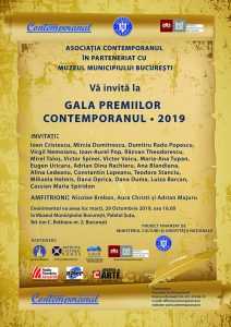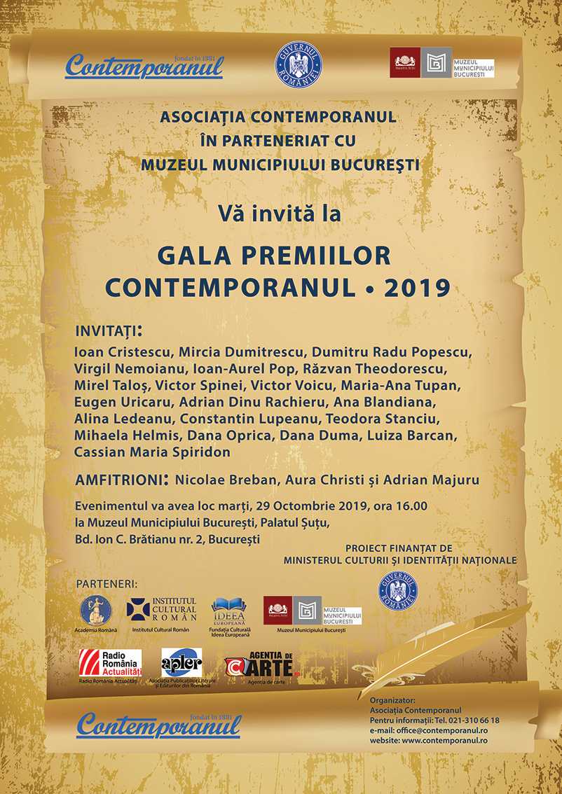 Marți, 29 octombrie 2019, ora 16.00, la Muzeul Municipiului București- Palatul Șuțu, Asociația Contemporanul, în parteneriat cu Muzeul Municipiului București, vă invită la Gala Premiilor Contemporanul · 2019. Printre invitați veți regăsi personalități de marcă ale culturii, civilizației și științei române ca, de pildă, Ioan Cristescu, Mircia Dumitrescu, Alina Ledeanu, Virgil Nemoianu, Ioan-Aurel Pop, Victor Voicu, Răzvan Theodorescu, Victor Spinei, Mirel Taloș, Marina Roman, Alexa Visarion, Dumitru Radu Popescu, Angela Martin, Adrian Dinu Rachieru, Ana Blandiana, Maria-Ana Tupan, Cassian Maria Spiridon, Eugen Uricaru, Dana Duma, Dana Oprica, Teodora Stanciu, Alex Ștefănescu, Alina Ledeanu, Constantin Lupeanu, Mircea Martin, Marian Victor Buciu ș.a. Amfitrioni: Nicolae Breban, Aura Christi și Adrian Majuru.