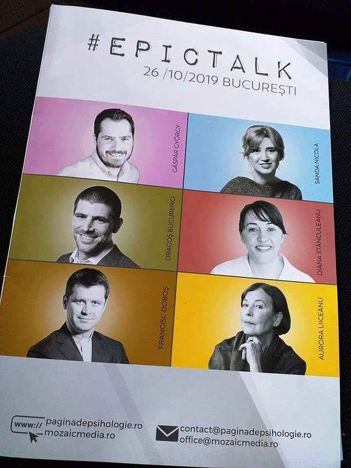 Sâmbătă, 26 octombrie 2019, sala Plaza a Hotelului Pullman Bucharest World Trade Center a găzduit evenimentul #EpicTalk 2019 – În căutarea adevărului despre noi și despre relațiile care ne cresc, organizat de Pagina de Psihologie și Mozaic Media. Evenimentul s-a bucurat de prezența unor speakeri carismatici, psihologul Aurora Liiceanu, psihologul Diana Stănculeanu, jurnalista Sanda Nicola, activistul Dragoș Bucurenci, preotul Francisc Doboș și psihologul Gáspár György, care au vorbit în fața a 700 de persoane despre relația dintre frați și surori (psihologul Diana Stănculeanu), relația dintre soacre și nurori (psihologul Aurora Liiceanu), despre relația cu Divinitatea (preotul Francisc Doboș), despre frici și anxietăți (jurnalista Sanda Nicola), despre identitate și sexualitate (activistul Dragoș Bucurenci), despre copiii invizibili (psihologul Gáspár György). Moderatoare a evenimentului a fost jurnalista Amalia Enache.