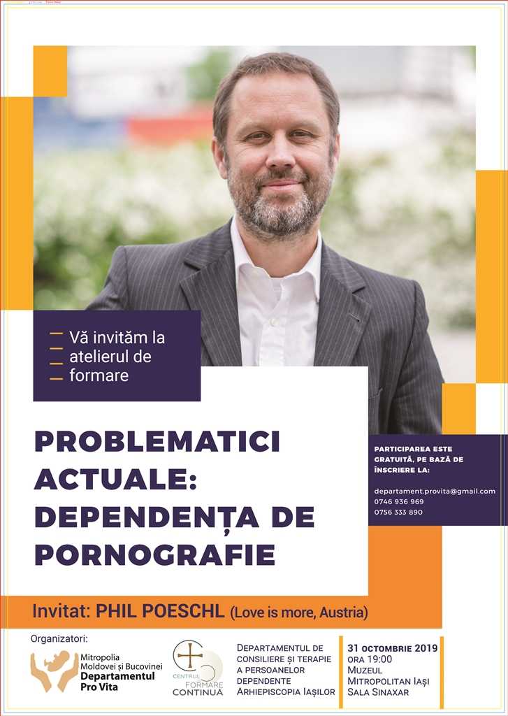 Joi,  31 octombrie 2019, de la ora 19:00, în sala Sinaxar a Muzeului Mitropolitan Iași, Departamentul Pro Vita, din cadrul Sectorului de Misiune al Arhiepiscopiei Iașilor, va organiza un seminar de formare intitulat „Problematici actuale: dependența de pornografie”, susținut de PHIL POESCHL, președinte al Asociației Love is more din Viena, Austria. Evenimentul este dedicat preoților, profesorilor, studenților și formatorilor din județele Iași, Botoșani și Neamț, obiectivul  principal fiind acela de a identifica principiile și metodele de tratare a persoanelor dependente de pornografie.