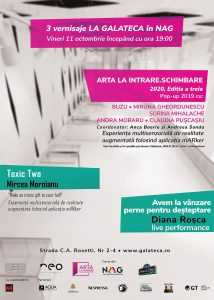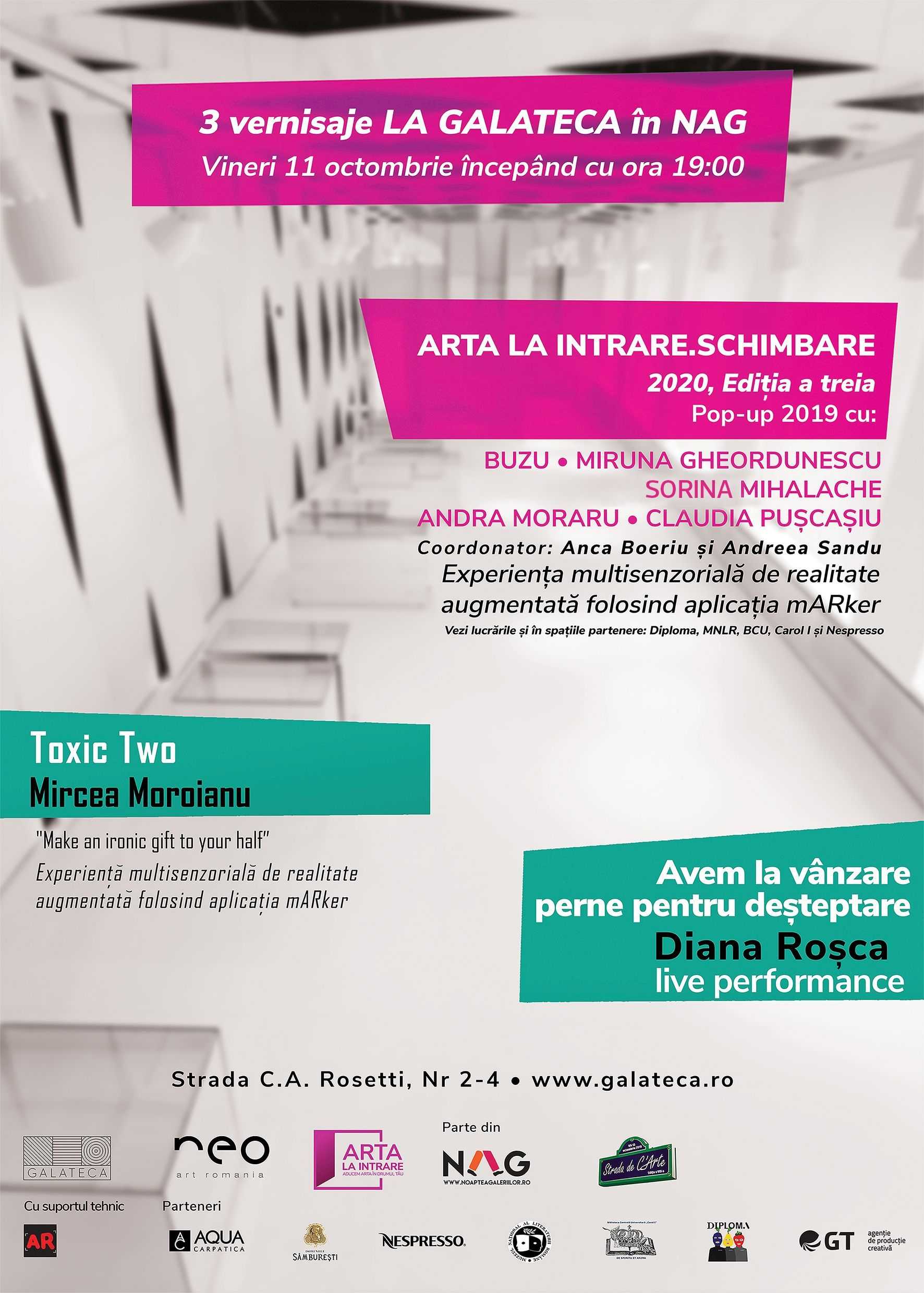 Vineri, 11 octombrie 2019, între orele 19:00 și 01:00, în cadrul Nopții Albe a Galeriilor ediția 2019, Galateca își invită publicul să participe la experiențe multimedia, realitate augmentată și live performance cu triplu vernisaj: ARTA LA INTRARE.SCHIMBARE – pop-up, TOXIC TWO și AVEM PERNE DE DEȘTEPTARE. AgențiadeCarte.ro este partener media.