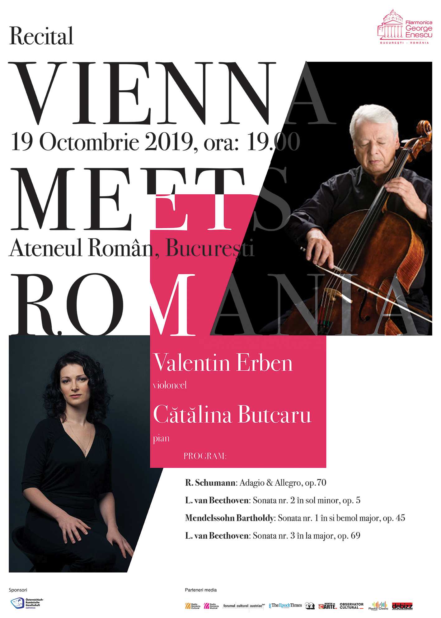 Clasic și romantic! Muzică de cea mai bună calitate, un program atractiv, alcătuit din adevărate hit-uri ale muzicii clasice, și prezența în România a unuia dintre fondatorii legendarului cvartet Alban Berg, iată ingredientele unui nou eveniment special ce va avea loc pe scena Ateneului Român, pe 19 octombrie 2019, de la ora 19:00. În desfășurare de câțiva ani pe scenele din România, proiectul Vienna meets România, inițiat de pianista Cătălina Butcaru și dedicat întâlnirilor speciale ale muzicienilor din cele două țări cu publicul, dar și colaborărilor și schimburilor de idei și experiență, înscrie în programul toamnei muzicale bucureștene un nou recital excepțional. Binecunoscută publicului din România, deși stabilită în capitala Austriei unde se bucură de un frumos parcurs artistic, pianista Cătălina Butcaru îl invită de data aceasta pe scena Ateneului Român pe violoncelistul renumitului cvartet Alban Berg, Valentin Erben. Este o reîntâlnire specială între pianista aflată acum la maturitatea artistică și celebrul violoncelist, membru fondator al cvartetului care a scris pagini de istorie în interpretarea muzicii de cameră, un adevărat etalon pentru muzicieni și una dintre cele mai iubite formații camerale de publicul de pe toate continentele. Cei doi au mai cântat împreună în urmă cu două decenii, atunci când experimentatul și celebrul muzician a invitat-o pe tânăra pianistă să îi fie alături într-o serie de concerte. AgențiadeCarte.ro este partener media al evenimentului.