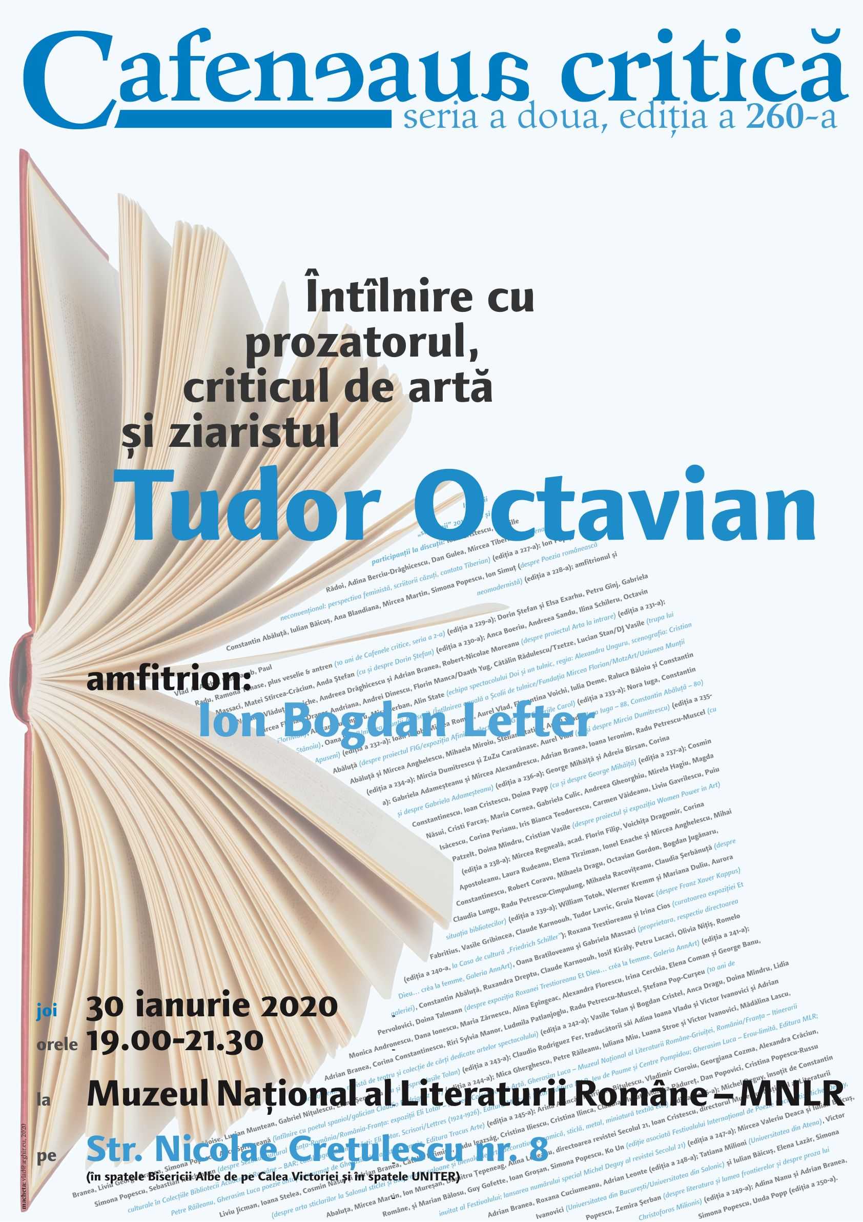 Joi, 30 ianuarie 2020, orele 19.00-21.30, la Muzeul Naţional al Literaturii Române din Bucureşti – MNLR, Tudor Octavian, binecunoscut ziarist, important critic şi istoric de artă, dar mai ales un foarte valoros prozator devenit recent octogenar (născut pe 12 decembrie 1939), vine la Cafeneaua critică pentru o discuţie despre viaţa şi cariera sa. Amfitrion: Ion Bogdan Lefter.
